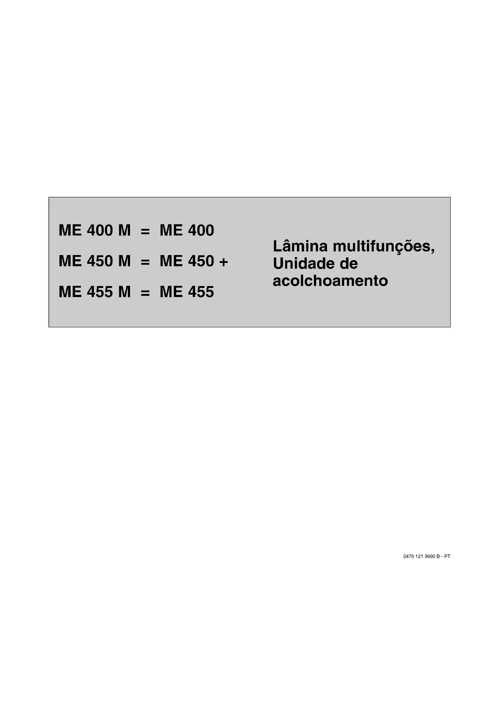 Fornecimento Pos. Designação Unids. 1 Aparelho base 1 2 Manípulo rotativo 2 3 Parafuso 2 4 Grampo do cabo 2 Grampo do cabo 3 (ME 455/ M) 5 Parte inferior da cesta de recolha 1 6 Parte superior da cesta de recolha 1 7Perno 2 8 Guia do cabo 1 Guia do cabo (ME 455/ M) 2 9 Unidade de acolchoamento (ME 450 M, ME 455 M) 1 10 Manual de utilização 1