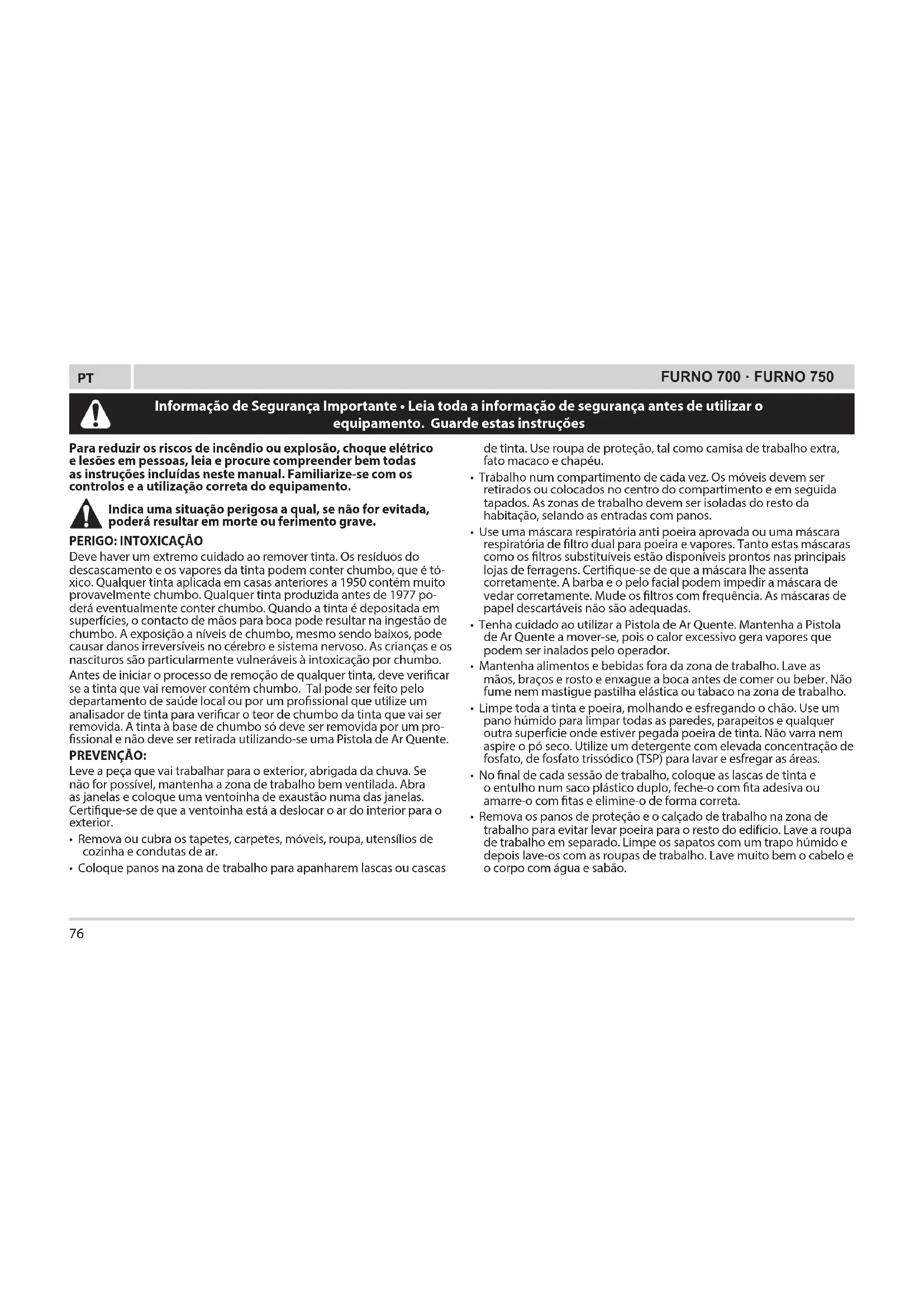 Deve haver um extremo cuidado ao remover tinta. Os resíduos do descascamento e os vapores da tinta podem conter chumbo, que é tó- xico. Qualquer tinta aplicada em casas anteriores a 1950 contém muito provavelmente chumbo. Qualquer tinta produzida antes de 1977 po- derá eventualmente conter chumbo. Quando a tinta é depositada em superfícies, o contacto de mãos para boca pode resultar na ingestão de chumbo. A exposição a níveis de chumbo, mesmo sendo baixos, pode causar danos irreversíveis no cérebro e sistema nervoso. As crianças e os nascituros são particularmente vulneráveis à intoxicação por chumbo. Antes de iniciar o processo de remoção de qualquer tinta, deve vericar se a tinta que vai remover contém chumbo. Tal pode ser feito pelo departamento de saúde local ou por um prossional que utilize um analisador de tinta para vericar o teor de chumbo da tinta que vai ser removida. A tinta à base de chumbo só deve ser removida por um pro- ssional e não deve ser retirada utilizando-se uma Pistola de Ar Quente. PREVENÇÃO: Leve a peça que vai trabalhar para o exterior, abrigada da chuva. Se não for possível, mantenha a zona de trabalho bem ventilada. Abra as janelas e coloque uma ventoinha de exaustão numa das janelas. Certique-se de que a ventoinha está a deslocar o ar do interior para o exterior.