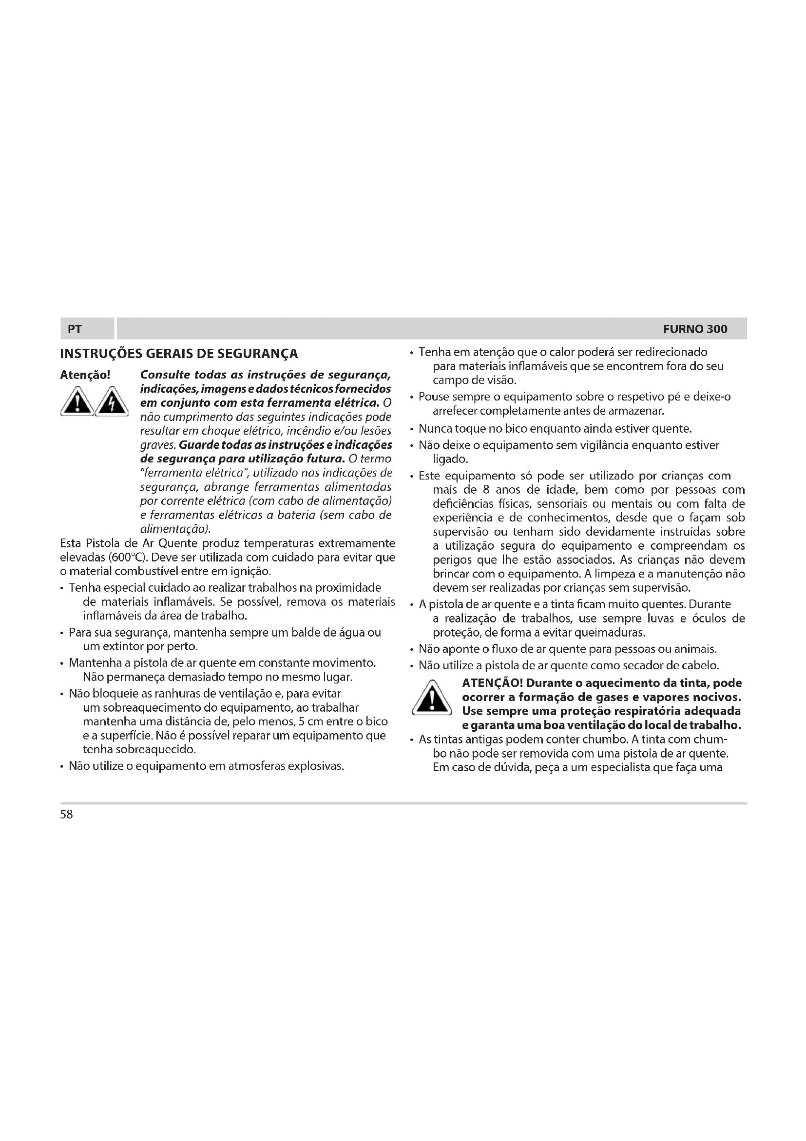 - As tintas antigas podem conter chumbo. A tinta com chum- bo não pode ser removida com uma pistola de ar quente. Em caso de dúvida, peça a um especialista que faça umaFURNO 300