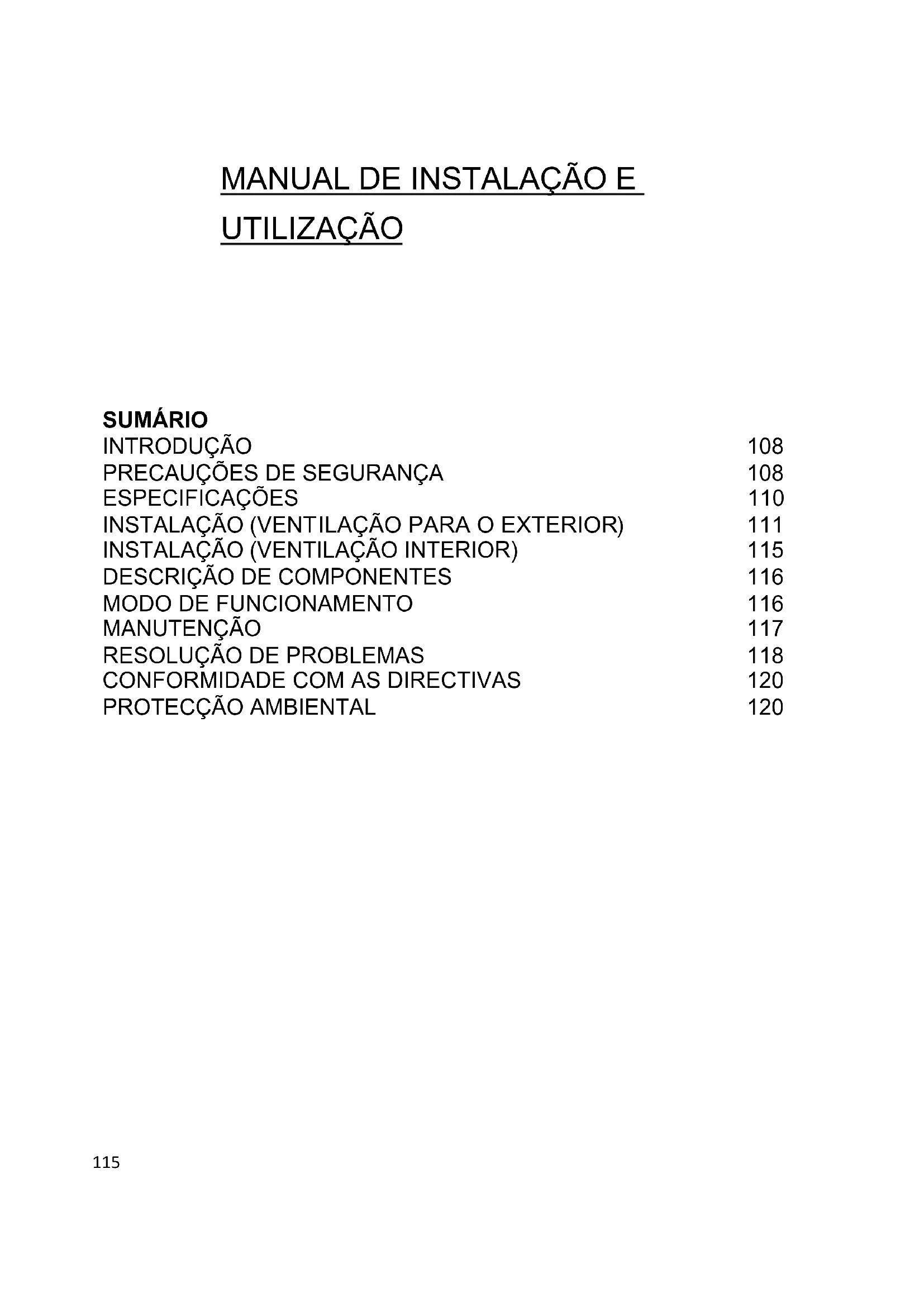 ESPECIFICAÇÕES 110 INSTALAÇÃO (VENT