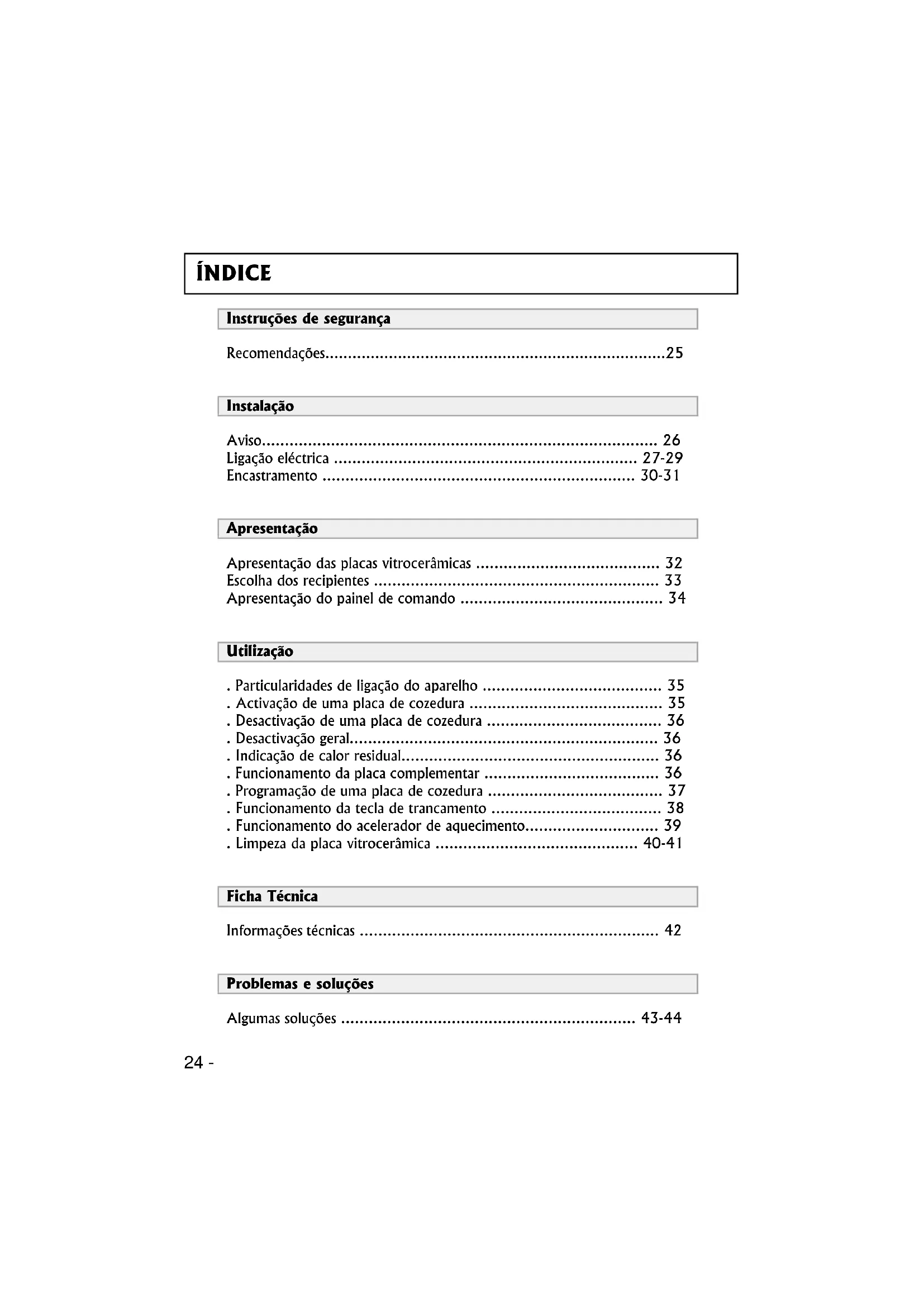 - Problemas e soluções Algumas soluções -44 ÍNDICE- 25 Durante o funcionamento do aparelho ou após desligar uma das placa de cozedura, aconselha-se a manter as crianças afastadas enquanto o indicador de calor residual estiver aceso, para evitar o risco de queimaduras graves. Sempre que cozinhar com margarina, óleo ou qualquer outra gordura, ter o cuidado de ir vigiando o cozinhado, porque as gorduras, quando muito aquecidas, podem rapidamente inflamar. As folhas de alumínio e os recipientes de plástico não devem ser colocados sobre as superfícies quentes. A placa de cozedura de halogéneo que equipa alguns aparelhos emite uma luz bastante forte. Não olhar fixamente para as lâmpadas desta placa. Após utilização da placa vitrocerâmica, convém fazer uma pequena limpeza para evitar a acumulação de sujidade e de gordura, pois estas, se tornarem a cozer, queimam e provocam fumo e cheiros desagradáveis, sem contar com o risco de propagação de incêndio. LER ATENTAMENTE ESTE MANUAL, PARA PODER TIRAR TODO O PARTIDO DO APARELHO. Aconselhamos que este manual seja guardado para posterior consulta e que nele seja anotado, antes da instalação do aparelho, o respectivo número de série para os casos em que, eventualmente, seja necessário recorrer à intervenção do Serviço Após Venda Placa de identificação (na parte inferior do aparelho) O painel de comando da placa é muito sensível; não lhe pôr em cima recipientes quentes. Nunca cozinhar directamente sobre a placa sem utilizar recipientes. Colocar sempre os recipientes bem ao centro da placa de cozedura seleccionada. Não utilizar a superfície da placa como tábua para cortar alimentos ou para efectuar outros trabalhos. Não arrastar os recipientes sobre a placa, pois pode riscar. Não colocar objectos pesados em cima placa, porque podem cair e danificá-la. Não colocar sobre a placa nenhum objecto seja ele de que natureza for. No caso improvável de aparecer uma racha no vidro, desligar imediatamente o aparelho da corrente e contactar directamente o Serviço Após Venda. INSTRUÇÕES DE SEGURANÇA RECOMENDAÇÕES26 - A instalação de aparelhos electrodomésticos no local a que se destinam é uma operação delicada que, caso não seja devidamente efectuada, pode ter graves consequências relativamente à segurança dos seus utilizadores. Assim sendo, torna-se imperativo confiar esta tarefa a um profissional, para que a sua execução seja feita de acordo com as normas técnicas em vigor. Se apesar deste aviso a instalação for feita por alguém não qualificado, o Grupo Candy declina qualquer responsabilidade em caso de avaria técnica do produto, quer provoque ou não danos materiais e/ou pessoais. p. 43