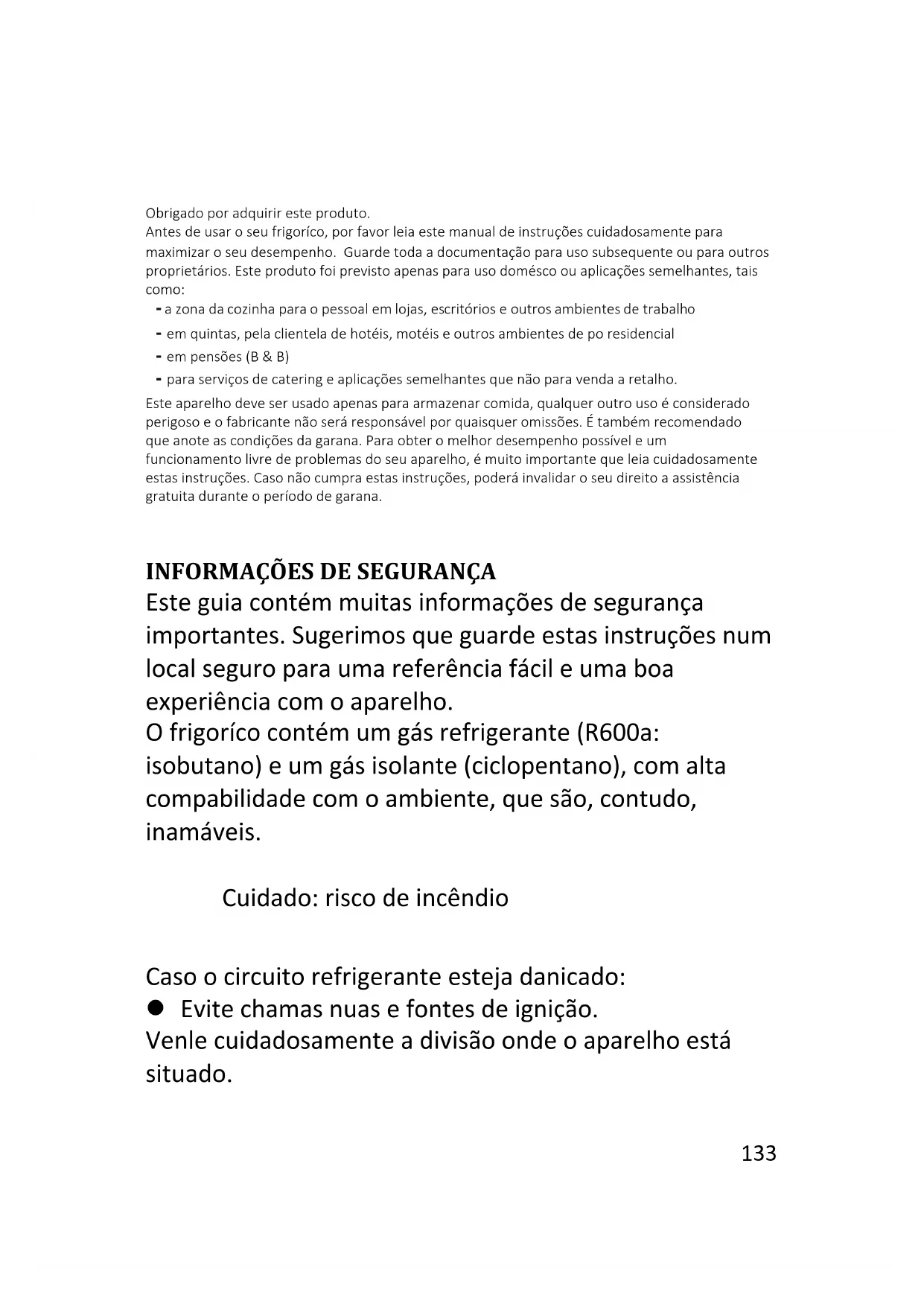 Obrigado por adquirir este produto. Antes de usar o seu frigorífico, por favor leia este manual de instruções cuidadosamente para maximizar o seu desempenho. Guarde toda a documentação para uso subsequente ou para outros proprietários. Este produto foi previsto apenas para uso doméstico ou aplicações semelhantes, tais como: - a zona da cozinha para o pessoal em lojas, escritórios e outros ambientes de trabalho - em quintas, pela clientela de hotéis, motéis e outros ambientes de tipo residencial - em pensões (B & B) - para serviços de catering e aplicações semelhantes que não para venda a retalho. Este aparelho deve ser usado apenas para armazenar comida, qualquer outro uso é considerado perigoso e o fabricante não será responsável por quaisquer omissões. É também recomendado que anote as condições da garantia. Para obter o melhor desempenho possível e um funcionamento livre de problemas do seu aparelho, é muito importante que leia cuidadosamente estas instruções. Caso não cumpra estas instruções, poderá invalidar o seu direito a assistência gratuita durante o período de garantia.