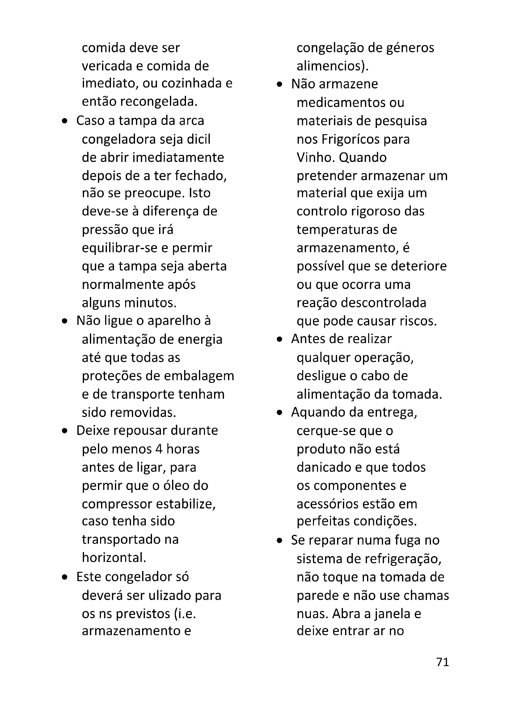 Este guia contém muitas informações de segurança importantes. Sugerimos que guarde estas instruções num local seguro para uma referência fácil e uma boa experiência com o aparelho. O frigorífico contém um gás refrigerante (R600a: isobutano) e um gás isolante (ciclopentano), com alta compatibilidade com o ambiente, que são, contudo, inflamáveis. Cuidado: risco de incêndio Caso o circuito refrigerante esteja danificado: Evite chamas nuas e fontes de ignição. Ventile cuidadosamente a divisão onde o aparelho está situado. Tempo de funcionamento71 comida deve ser verificada e comida de imediato, ou cozinhada e então recongelada. Caso a tampa da arca congeladora seja difícil de abrir imediatamente depois de a ter fechado, não se preocupe. Isto deve-se à diferença de pressão que irá equilibrar-se e permitir que a tampa seja aberta normalmente após alguns minutos. Não ligue o aparelho à alimentação de energia até que todas as proteções de embalagem e de transporte tenham sido removidas. Deixe repousar durante pelo menos 4 horas antes de ligar, para permitir que o óleo do compressor estabilize, caso tenha sido transportado na horizontal. Este congelador só deverá ser utilizado para os fins previstos (i.e. armazenamento e congelação de géneros alimentícios). Não armazene medicamentos ou materiais de pesquisa nos Frigoríficos para Vinho. Quando pretender armazenar um material que exija um controlo rigoroso das temperaturas de armazenamento, é possível que se deteriore ou que ocorra uma reação descontrolada que pode causar riscos. Antes de realizar qualquer operação, desligue o cabo de alimentação da tomada. Aquando da entrega, certifique-se que o produto não está danificado e que todos os componentes e acessórios estão em perfeitas condições. Se reparar numa fuga no sistema de refrigeração, não toque na tomada de parede e não use chamas nuas. Abra a janela e deixe entrar ar no72 compartimento. Depois ligue a um centro de serviço para solicitar uma reparação. Não use extensões ou adaptadores. Não puxe ou dobre o cabo de alimentação excessivamente ou toque na ficha com as mãos molhadas. Não danifique a ficha e/ou o cabo de alimentação; isso pode causar choques elétricos ou incêndios. Se o cabo de alimentação estiver danificado, o mesmo deve ser substituído pelo serviço de assistência técnica do fabricante ou por um técnico qualificada para evitar perigo Não coloque ou armazene materiais inflamáveis e altamente voláteis como éter, petróleo, GPL, gás propano, latas de spray aerosol, adesivos, álcool puro, etc. Estes materiais podem provocar uma explosão. Não use ou armazene sprays inflamáveis, tais como tinta em spray, perto dos Frigoríficos para Vinho. Isso pode causar uma explosão ou incêndio. Não coloque objetos e/ou recipientes com água no topo do aparelho. Não recomendamos a utilização de extensões e adaptadores. Não elimine o aparelho através do fogo. Tenha cuidado para não danificar o circuito/tubos de refrigeração do aparelho durante o transporte e utilização. Em caso de danos, não exponha o aparelho a uma fonte potencial de ignição e ventile de imediato a divisão onde o aparelho se situa. O sistema de refrigeração posicionado atrás e no interior dos Frigoríficos para Vinho73 contém refrigerante. Logo, evite danificar os tubos. Não use aparelhos elétricos no interior dos compartimentos para armazenamento de comida do aparelho, a não ser que sejam do tipo recomendado pelo fabricante. Não danifique o circuito de refrigeração. Não utilize dispositivos mecânicos ou outros meios para acelerar o processo de descongelação, que não os recomendados pelo fabricante. Não use aparelhos elétricos no interior dos compartimentos para armazenamento de comida do aparelho, a não ser que sejam do tipo recomendado pelo fabricante. Não tocar os elementos de refrigeração internos, especialmente com as mãos molhadas, pois pode sofrer queimaduras ou ferimentos graves. Mantenha as aberturas de ventilação no revestimento do aparelho ou na estrutura integrada, livres de obstruções. Não use objetos pontiagudos ou afiados tais como facas ou garfos para remover o gelo. Nunca use secadores de cabelo, aquecedores elétricos ou outros aparelhos similares para a descongelação. Não use uma faca ou um objecto afiado para remover o gelo que possa existir. Caso os utilize, o circuito de refrigerante pode danificar-se, e a fuga que daí decorrer pode causar um incêndio ou danificar os seus olhos. Não use dispositivos mecânicos ou outro equipamento para acelerar o processo de descongelamento. Evite completamente a utilização de chamas74 nuas ou equipamento elétrico, tais como aquecedores, máquinas de limpeza a vapor, velas, lâmpadas a óleo e similares de forma a acelerar a fase de descongelamento. Nunca use água para lavar a área do compressor, limpe-a com um pano seco cuidadosamente depois de limpar para evitar a ferrugem. Recomendamos que mantenha a ficha limpa, quaisquer resíduos de poeira excessivos na ficha podem causar um incêndio. O produto foi concebido e fabricado apenas para uso doméstico. A garantia será anulada caso o produto seja instalado ou utilizado em instalações comerciais ou não-residenciais. O produto deve ser instalado, localizado e operado corretamente de acordo com as instruções contidas no folheto de Instruções para o Utilizador fornecido. A garantia só é aplicável a produtos novos e não pode ser transferida caso o produto seja vendido novamente. A nossa empresa declina qualquer responsabilidade por danos incidentais ou consequentes. A garantia não diminui de qualquer forma os seus direitos estatutários ou legais. Não realize reparações neste Frigorífico para Vinhos. Todas as intervenções devem ser realizadas exclusivamente por pessoal qualificado. Caso esteja a descartar um produto velho com um fecho ou trava instalado na porta, certi