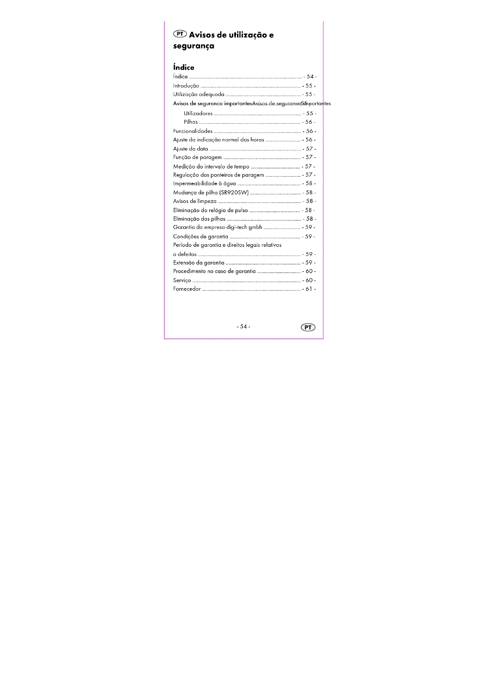 ParabénsPGAmpro da seu novo relógio de pulso. Vocé decidiu-se por um relógio de pulso de grande qualidae. O manuel de utilização faz parte de este relógio de pulso. Aqui encontrará avisos importantes referentes à seguranca, autilização e ao descarte do relógio de pulso.Leia atentamente este manual antes de utilizes o relógio de pulso.Use-o apenas como e descririto e so nos Campos de aplicação indicados. Se vender o relógio de pulso ou o entregar a outra Pessoa, entrega-lhe tambem este manul.