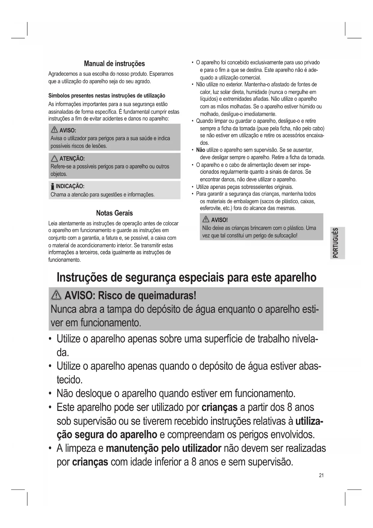 - Para garantir a segurança das crianças, mantenha todos os materiais de embalagem (sacos de plástico, caixas, esferovite, etc.) fora do alcance das mesmas. AVISO! Não deixe as crianças brincarem com o plástico. Uma vez que tal constitui um perigo de sufocação! Manual de instruções Agradecemos a sua escolha do nosso produto. Esperamos que a utilização do aparelho seja do seu agrado. Símbolos presentes nestas instruções de utilização As informações importantes para a sua segurança estão assinaladas de forma especíca. É fundamental cumprir estas instruções a m de evitar acidentes e danos no aparelho: AVISO: Avisa o utilizador para perigos para a sua saúde e indica possíveis riscos de lesões. ATENÇÃO: Refere-se a possíveis perigos para o aparelho ou outros objetos. INDICAÇÃO: Chama a atencão para sugestões e informações. Notas Gerais Leia atentamente as instruções de operação antes de colocar o aparelho em funcionamento e guarde as instruções em conjunto com a garantia, a fatura e, se possível, a caixa com o material de acondicionamento interior. Se transmitir estas informações a terceiros, ceda igualmente as instruções de funcionamento. Instruções de segurança especiais para este aparelho AVISO: Risco de queimaduras! Nunca abra a tampa do depósito de água enquanto o aparelho esti- ver em funcionamento.