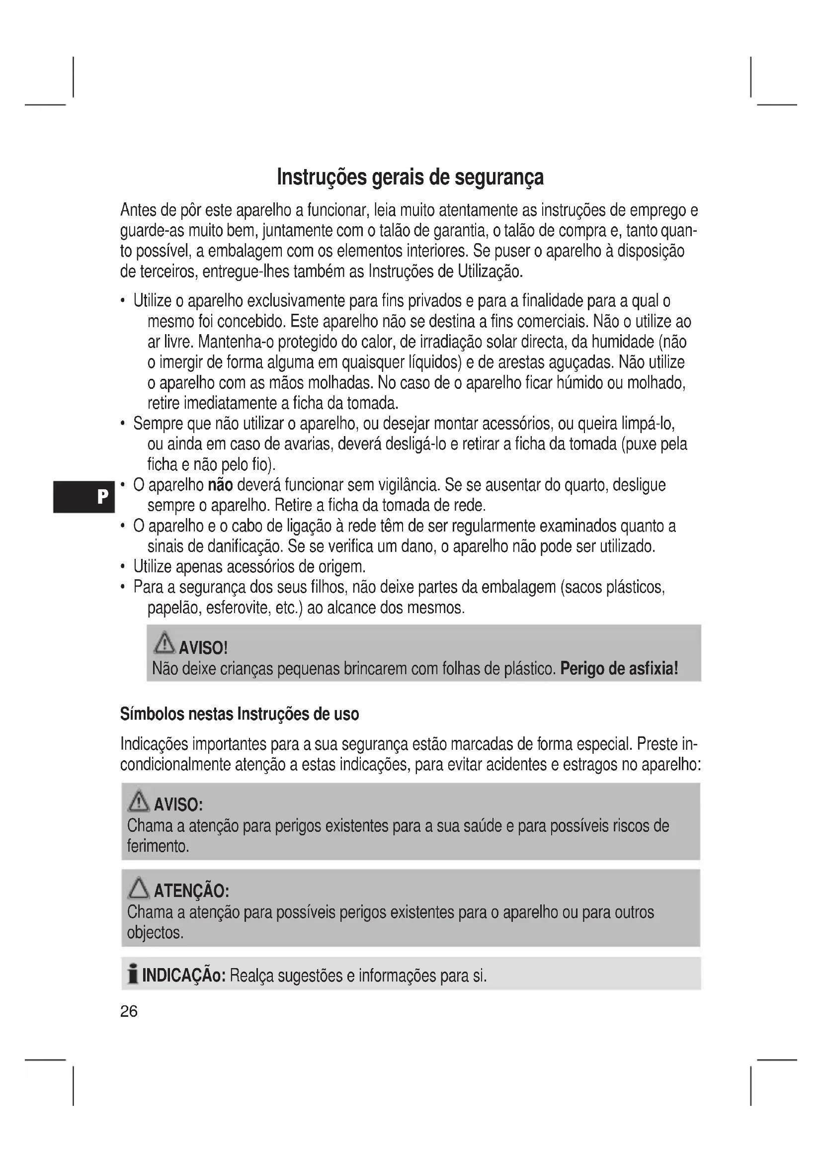 - Para a segurança dos seus lhos, não deixe partes da embalagem (sacos plásticos, papelão, esferovite, etc.) ao alcance dos mesmos. AVISO! Não deixe crianças pequenas brincarem com folhas de plástico. Perigo de asfixia! Símbolos nestas Instruções de uso Indicações importantes para a sua segurança estão marcadas de forma especial. Preste in- condicionalmente atenção a estas indicações, para evitar acidentes e estragos no aparelho: AVISO: Chama a atenção para perigos existentes para a sua saúde e para possíveis riscos de ferimento. ATENÇÃO: Chama a atenção para possíveis perigos existentes para o aparelho ou para outros objectos. INDICAÇÃo: Realça sugestões e informações para si.27