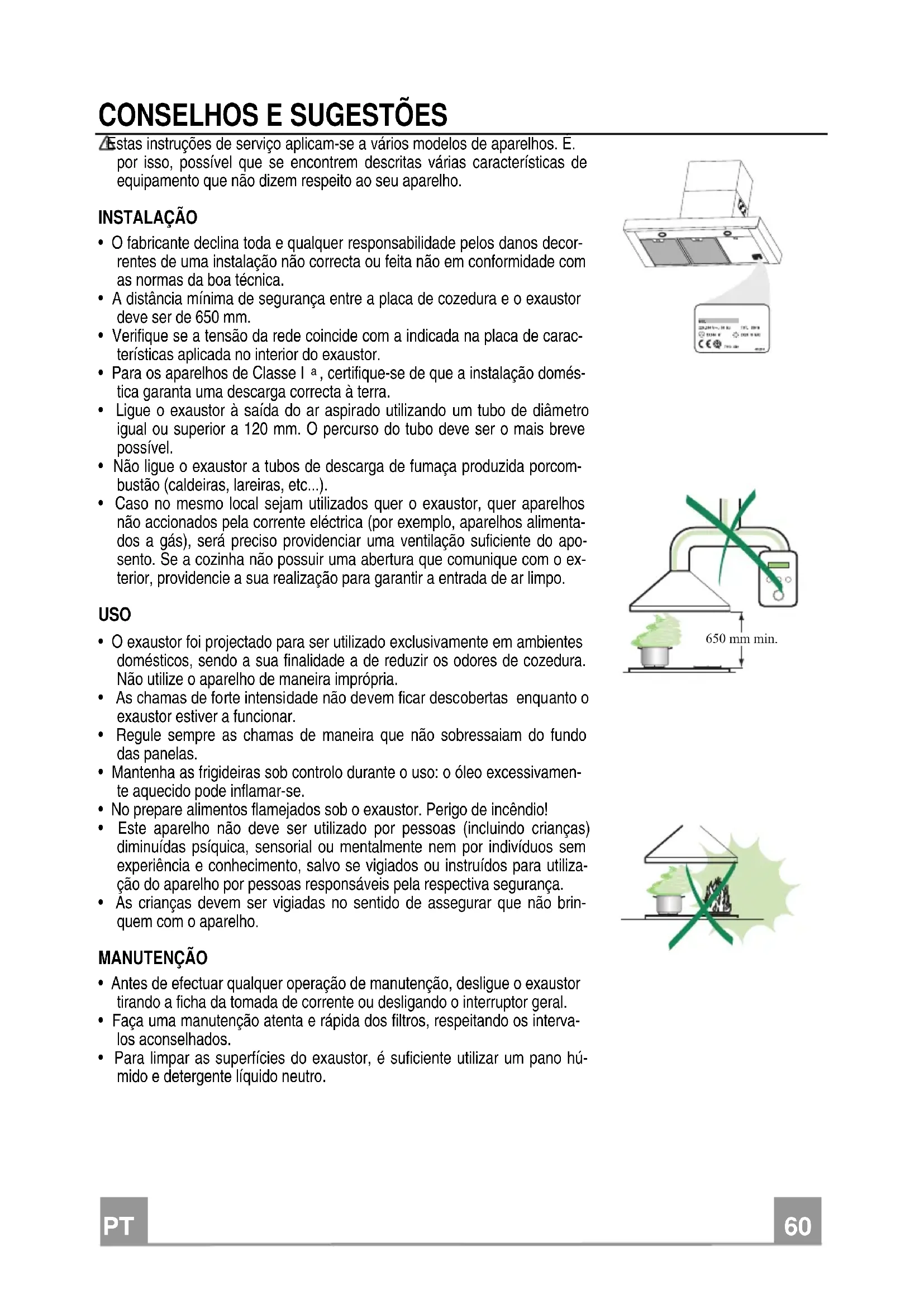 - Para limpar as superfícies do exaustor, é suficiente utilizar um pano hú- mido e detergente líquido neutro. 650 mm min.PT
