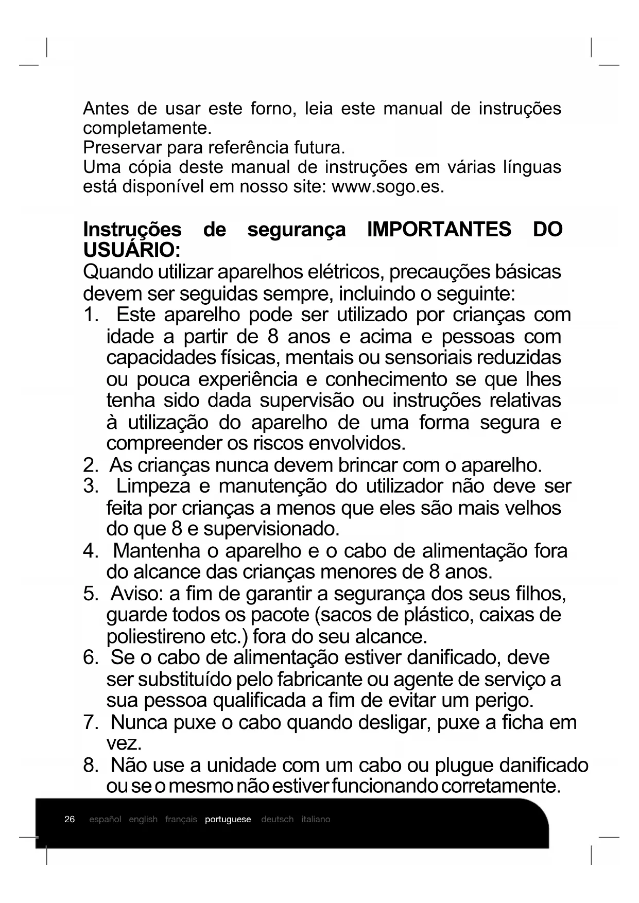 table ou un comptoir ou dans un meuble étagère.26 español english français portuguese deutsch italiano Antes de usar este forno, leia este manual de instruções completamente. Preservar para referência futura. Uma cópia deste manual de instruções em várias línguas está disponível em nosso site: www.sogo.es. Instruções de segurança IMPORTANTES DO USUÁRIO: Quando utilizar aparelhos elétricos, precauções básicas devem ser seguidas sempre, incluindo o seguinte: