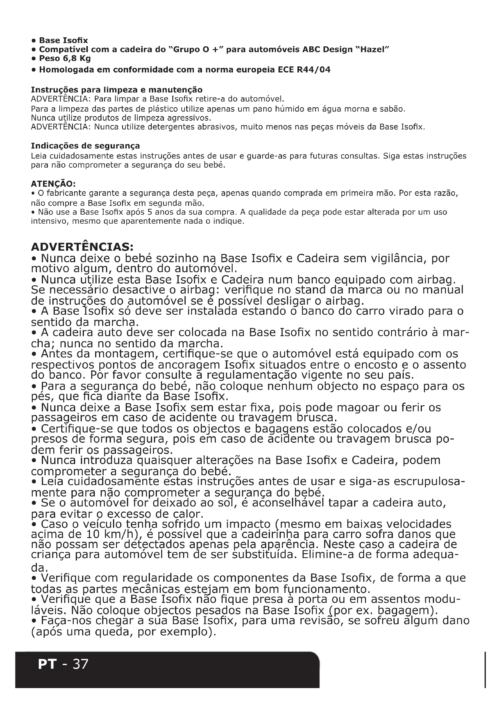 - Homologada em conformidade com a norma europeia ECE R44/04 Instruções para limpeza e manutenção ADVERTÊNCIA: Para limpar a Base Isox retire-a do automóvel. Para a limpeza das partes de plástico utilize apenas um pano húmido em água morna e sabão. Nunca utilize produtos de limpeza agressivos. ADVERTÊNCIA: Nunca utilize detergentes abrasivos, muito menos nas peças móveis da Base Isox. Indicações de segurança Leia cuidadosamente estas instruções antes de usar e guarde-as para futuras consultas. Siga estas instruções para não comprometer a segurança do seu bebé. ATENÇÃO: