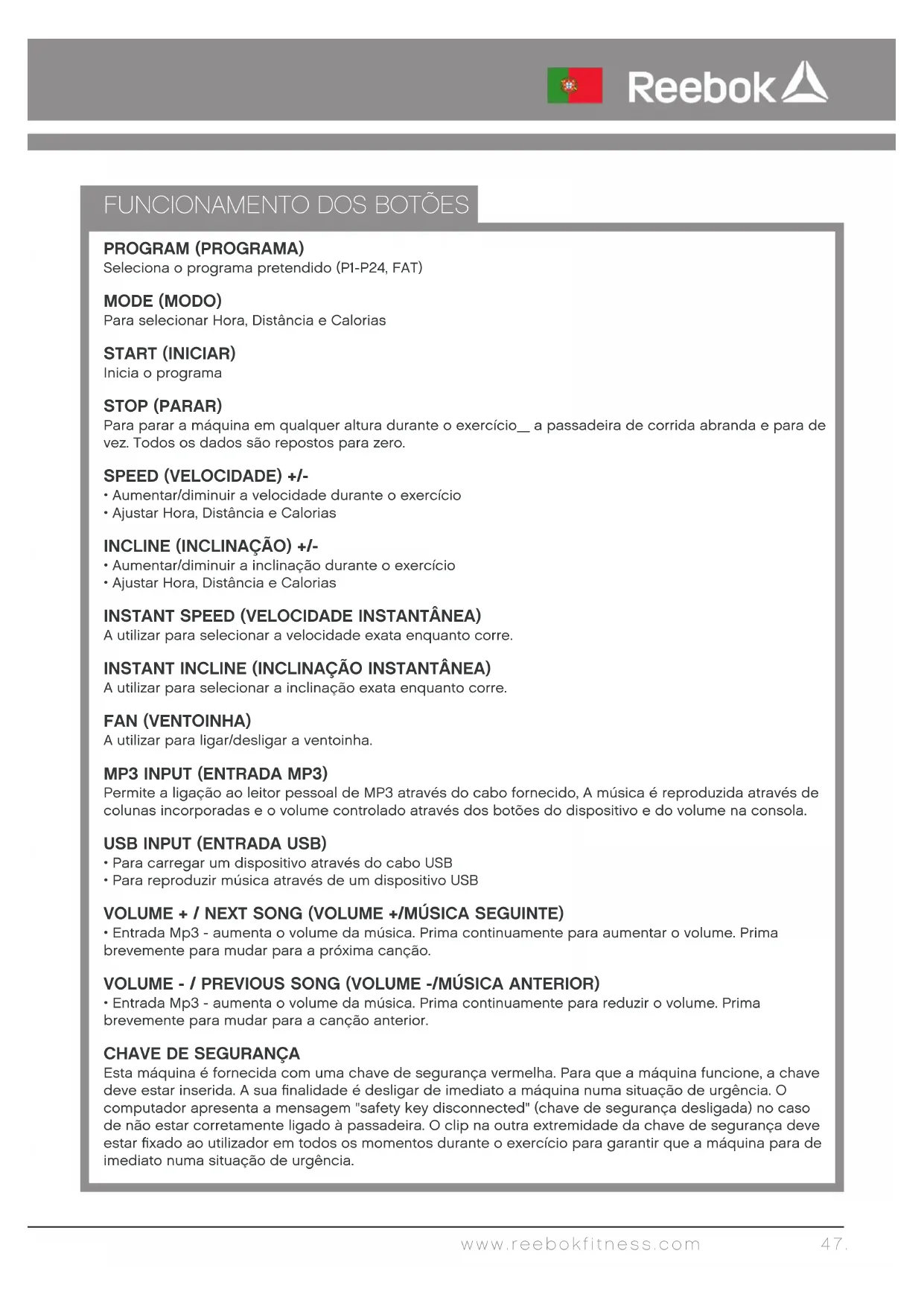 Esta máquina é fornecida com uma chave de segurança vermelha. Para que a máquina funcione, a chave deve estar inserida. A sua finalidade é desligar de imediato a máquina numa situação de urgência. O computador apresenta a mensagem "safety key disconnected" (chave de segurança desligada) no caso de não estar corretamente ligado à passadeira. O clip na outra extremidade da chave de segurança deve estar fixado ao utilizador em todos os momentos durante o exercício para garantir que a máquina para de imediato numa situação de urgência. www.reebokfitness.com 47.CONTROLOS DO GUIADOR SPEED (VELOCIDADE) +/-