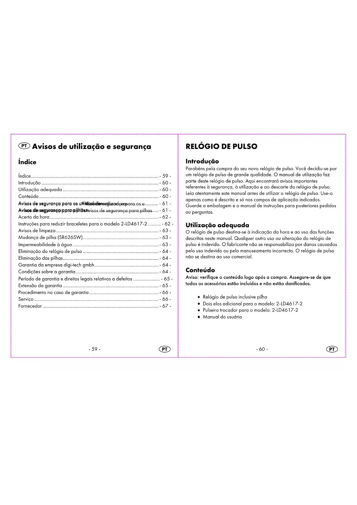 Avisos de utilização e segurança Índice Índice ............................................................................................................ - 59 - Introdução ................................................................................................... - 60 - Utilização adequada ................................................................................. - 60 - Conteúdo ..................................................................................................... - 60 - Avisos de segurança para os u Avisos de segurança para os uAvisos de segurança para os u Avisos de segurança para os utilizadores tilizadorestilizadores tilizadores........................................... - 61 - Avisos de segurança para pilhas Avisos de segurança para pilhasAvisos de segurança para pilhas Avisos de segurança para pilhas .......................................................... - 61 - Acerto da hora ............................................................................................ - 62 - Instruções para reduzir braceletes para o modelo 2-LD4617-2 .......... - 62 - Avisos de limpeza ....................................................................................... - 63 - Mudança de pilha (SR626SW) ................................................................ - 63 - Impermeabilidade à água ......................................................................... - 63 - Eliminação do relógio de pulso ................................................................ - 64 - Eliminação das pilhas ................................................................................. - 64 - Garantia da empresa digi-tech gmbh ...................................................... - 64 - Condições sobre a garantia ...................................................................... - 64 - Período de garantia e direitos legais relativos a defeitos ...................... - 65 - Extensão da garantia ................................................................................. - 65 - Procedimento no caso de garantia ........................................................... - 66 - Serviço ......................................................................................................... - 66 - Fornecedor .................................................................................................. - 67 -