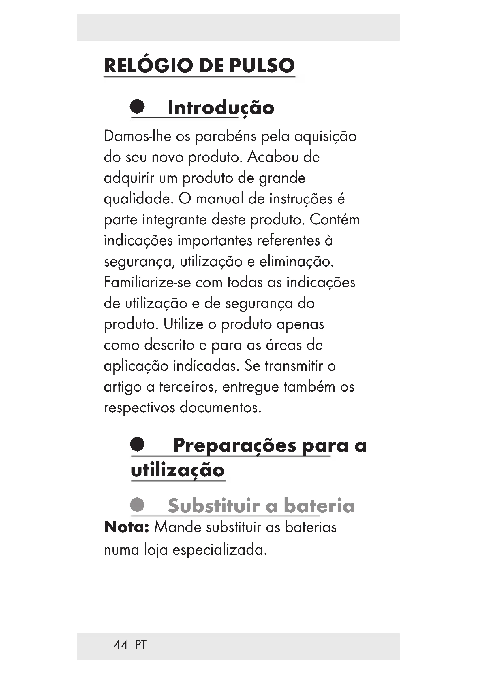 § Introdução Damos-lhe os parabéns pela aquisição do seu novo produto. Acabou de adquirir um produto de grande qualidade. O manual de instruções é parte integrante deste produto. Contém indicações importantes referentes à segurança, utilização e eliminação. Familiarize-se com todas as indicações de utilização e de segurança do produto. Utilize o produto apenas como descrito e para as áreas de aplicação indicadas. Se transmitir o artigo a terceiros, entregue também os respectivos documentos. § Preparações para a utilização § Substituir a bateria Nota: Mande substituir as baterias numa loja especializada.45 PT § Mostrador