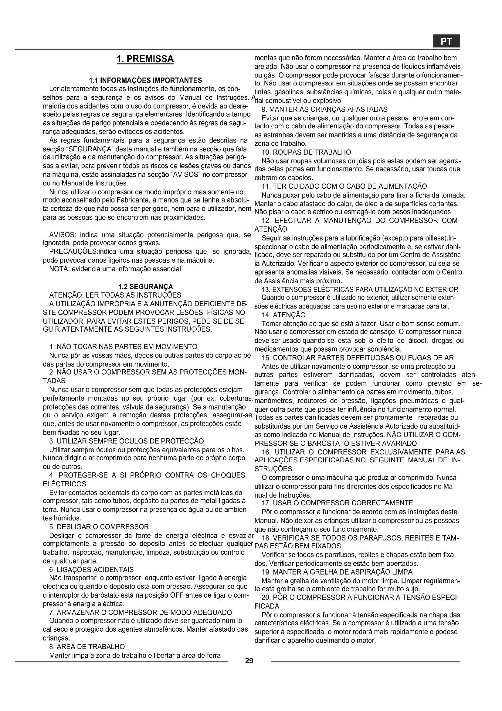 Ler atentamente todas as instruções de funcionamento, os con- selhos para a segurança e os avisos do Manual de Instruções. A maioria dos acidentes com o uso do compressor, é devida ao desre- VSHLWRSHODVUHJUDVGHVHJXUDQoDHOHPHQWDUHV,GHQWL¿FDQGRDWHPSR as situações de perigo potenciais e obedecendo às regras de segu- rança adequadas, serão evitados os acidentes. As regras fundamentais para a segurança estão descritas na secção “SEGURANÇA” deste manual e também na secção que fala da utilização e da manutenção do compressor. As situações perigo- sas a evitar, para prevenir todos os riscos de lesões graves ou danos na máquina, estão assinaladas na secção “AVISOS” no compressor ou no Manual de Instruções. Nunca utilizar o compressor de modo impróprio mas somente no modo aconselhado pelo Fabricante, a menos que se tenha a absolu- ta certeza de que não possa ser perigoso, nem para o utilizador, nem para as pessoas que se encontrem nas proximidades. AVISOS: indica uma situação potencialmente perigosa que, se ignorada, pode provocar danos graves. PRECAUÇÕES:indica uma situação perigosa que, se ignorada, pode provocar danos ligeiros nas pessoas e na máquina. NOTA: evidencia uma informação essencial