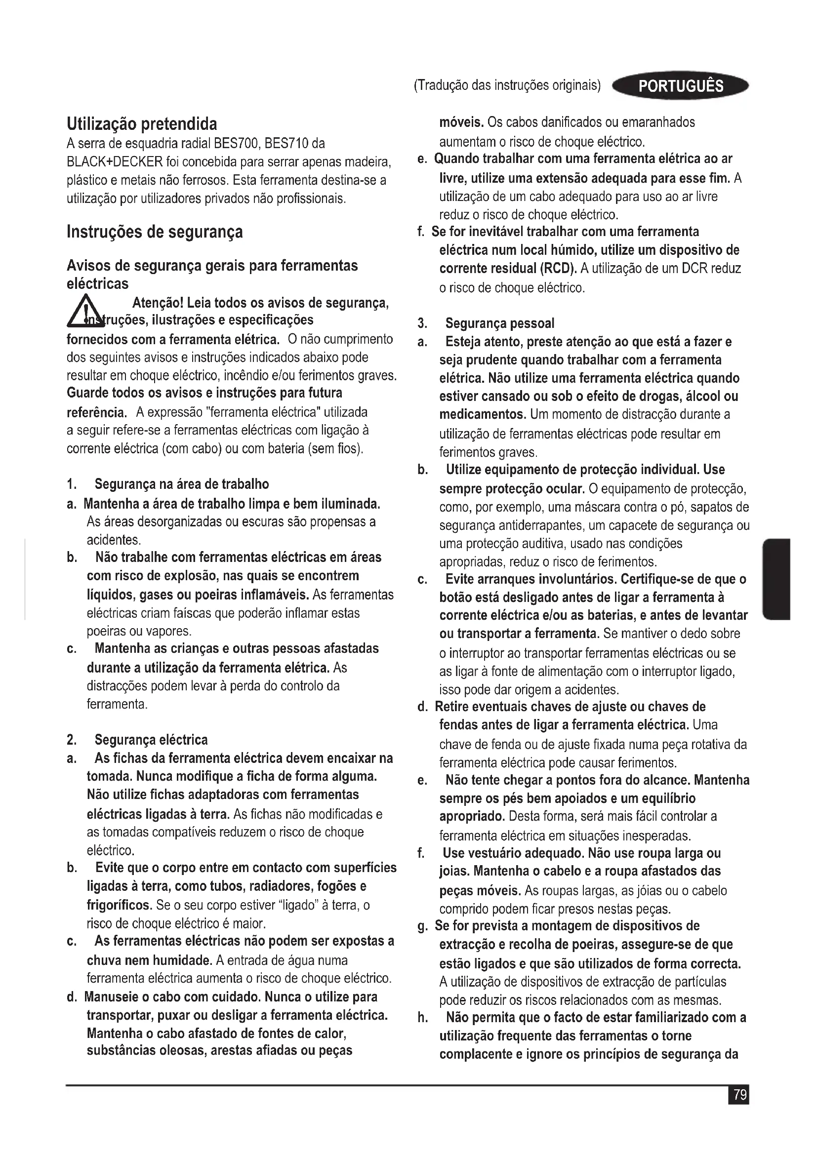 a. Aschasdaferramentaeléctricadevemencaixarna tomada.Nuncamodiqueachadeformaalguma. Nãoutilizechasadaptadorascomferramentas eléctricas ligadas à terra. As chas não modicadas e as tomadas compatíveis reduzem o risco de choque eléctrico. b. Evitequeocorpoentreemcontactocomsuperfícies ligadasàterra,comotubos,radiadores,fogõese frigorícos.Se o seu corpo estiver “ligado” à terra, o risco de choque eléctrico é maior. c. Asferramentaseléctricasnãopodemserexpostasa chuva nem humidade. A entrada de água numa ferramenta eléctrica aumenta o risco de choque eléctrico. d. Manuseie o cabo com cuidado. Nunca o utilize para transportar, puxar ou desligar a ferramenta eléctrica. Mantenha o cabo afastado de fontes de calor, substânciasoleosas,arestasaadasoupeças móveis. Os cabos danicados ou emaranhados aumentam o risco de choque eléctrico. e. Quando trabalhar com uma ferramenta elétrica ao ar livre,utilizeumaextensãoadequadaparaessem.A utilização de um cabo adequado para uso ao ar livre reduz o risco de choque eléctrico. f. Se for inevitável trabalhar com uma ferramenta eléctrica num local húmido, utilize um dispositivo de corrente residual (RCD). A utilização de um DCR reduz o risco de choque eléctrico.