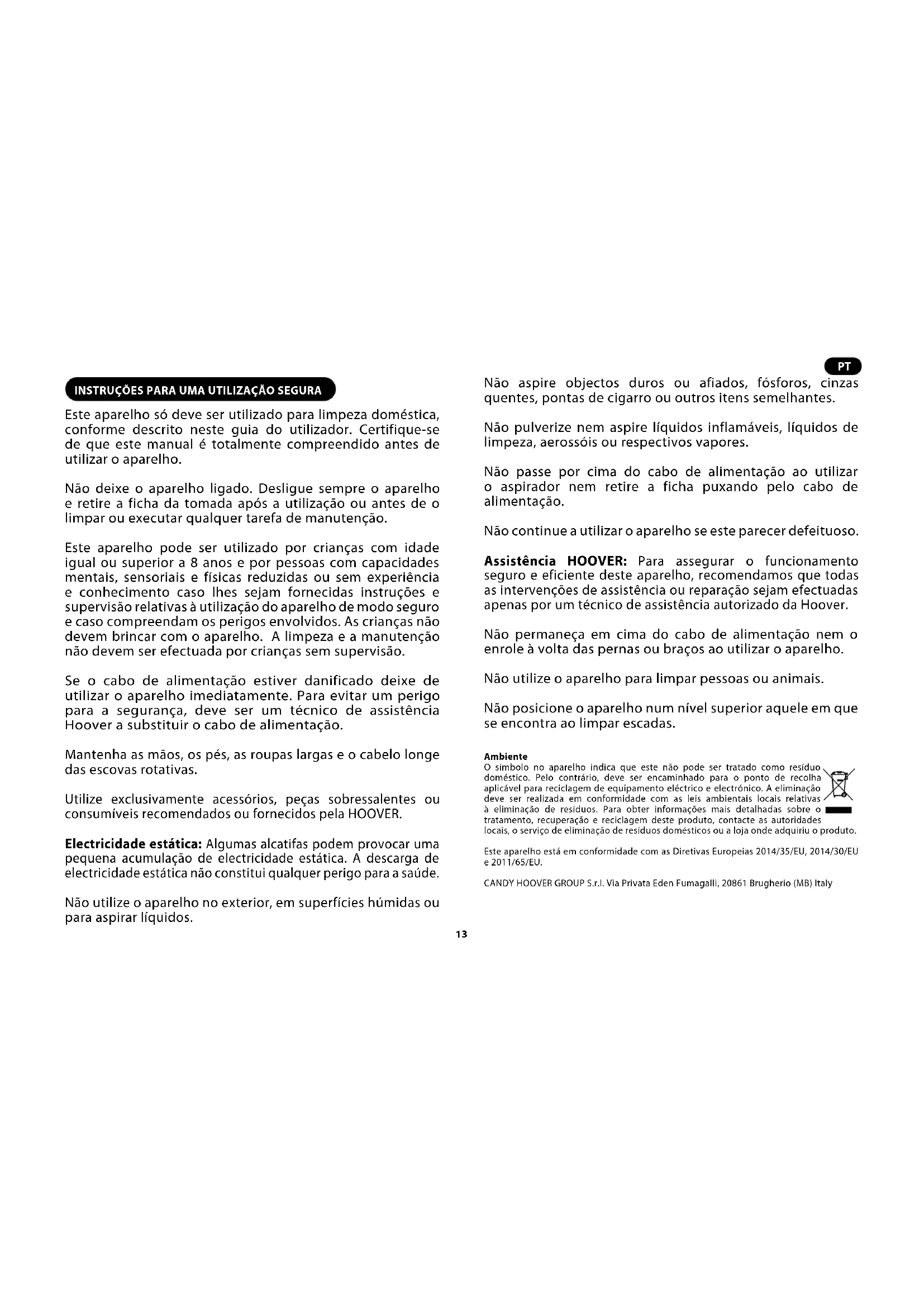 - L’aspirapolvere si è surriscaldato? In questo caso, il reset automatico richiede circa 45 minuti. INFORMAZIONI IMPORTANTI Parti di ricambio e di consumo Hoover Utilizzare sempre parti di ricambio originali Hoover che è possibile acquistare dal distributore locale Hoover o direttamente sul sito internet Hoover. Quando si ordinano delle parti di ricambio, ricordarsi sempre di fornire il numero di modello dell’apparecchio utilizzato. Qualità La qualità degli stabilimenti Hoover è stata sottoposta a valutazione indipendente. I nostri prodotti vengono realizzati mediante un sistema di qualità che soddisfa i requisiti ISO 9001. Assistenza e garanzia HOOVER Il prodotto è garantito, oltre che ai sensi di legge, alle condizioni e nei termini riportati sul certificato di garanzia convenzionale inserito nel prodotto. Il certificato dovrà essere conservato e mostrato al nostro Centro di Assistenza Tecnica Autorizzato, in caso di necessità, insieme allo scontrino comprovante l’acquisto dell’elettrodomestico. Puoi consultare le condizioni di garanzia anche sul nostro sito internet. Per ottenere assistenza compila l’apposito form on-line oppure contattaci al numero che trovi indicato nella pagina di assistenza del nostro sito internet. Queste condizioni potrebbero venire modificate senza obbligo di preavviso. ITINSTRUÇÕES PARA UMA UTILIZAÇÃO SEGURA Este aparelho só deve ser utilizado para limpeza doméstica, conforme descrito neste guia do utilizador. Certifique-se de que este manual é totalmente compreendido antes de utilizar o aparelho. Não deixe o aparelho ligado. Desligue sempre o aparelho e retire a ficha da tomada após a utilização ou antes de o limpar ou executar qualquer tarefa de manutenção. Este aparelho pode ser utilizado por crianças com idade igual ou superior a 8 anos e por pessoas com capacidades mentais, sensoriais e físicas reduzidas ou sem experiência e conhecimento caso lhes sejam fornecidas instruções e supervisão relativas à utilização do aparelho de modo seguro e caso compreendam os perigos envolvidos. As crianças não devem brincar com o aparelho. A limpeza e a manutenção não devem ser efectuada por crianças sem supervisão. Se o cabo de alimentação estiver danificado deixe de utilizar o aparelho imediatamente. Para evitar um perigo para a segurança, deve ser um técnico de assistência Hoover a substituir o cabo de alimentação. Mantenha as mãos, os pés, as roupas largas e o cabelo longe das escovas rotativas. Utilize exclusivamente acessórios, peças sobressalentes ou consumíveis recomendados ou fornecidos pela HOOVER. Electricidade estática: Algumas alcatifas podem provocar uma pequena acumulação de electricidade estática. A descarga de electricidade estática não constitui qualquer perigo para a saúde. Não utilize o aparelho no exterior, em superfícies húmidas ou para aspirar líquidos. Não aspire objectos duros ou afiados, fósforos, cinzas quentes, pontas de cigarro ou outros itens semelhantes. Não pulverize nem aspire líquidos inflamáveis, líquidos de limpeza, aerossóis ou respectivos vapores. Não passe por cima do cabo de alimentação ao utilizar o aspirador nem retire a ficha puxando pelo cabo de alimentação. Não continue a utilizar o aparelho se este parecer defeituoso. Assistência HOOVER: Para assegurar o funcionamento seguro e eficiente deste aparelho, recomendamos que todas as intervenções de assistência ou reparação sejam efectuadas apenas por um técnico de assistência autorizado da Hoover. Não permaneça em cima do cabo de alimentação nem o enrole à volta das pernas ou braços ao utilizar o aparelho. Não utilize o aparelho para limpar pessoas ou animais. Não posicione o aparelho num nível superior aquele em que se encontra ao limpar escadas. Ambiente O símbolo no aparelho indica que este não pode ser tratado como resíduo doméstico. Pelo contrário, deve ser encaminhado para o ponto de recolha aplicável para reciclagem de equipamento eléctrico e electrónico. A eliminação deve ser realizada em conformidade com as leis ambientais locais relativas à eliminação de resíduos. Para obter informações mais detalhadas sobre o tratamento, recuperação e reciclagem deste produto, contacte as autoridades locais, o serviço de eliminação de resíduos domésticos ou a loja onde adquiriu o produto. Este aparelho está em conformidade com as Diretivas Europeias 2014/35/EU, 2014/30/EU e 2011/65/EU. CANDY HOOVER GROUP S.r.l. Via Privata Eden Fumagalli, 20861 Brugherio (MB) Italy