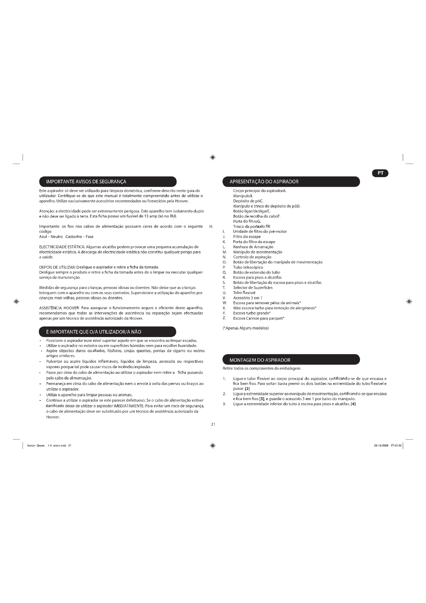 (*Apenas Alguns modelos) Retire todos os componentes da embalagem. Ligue o tubo exível ao corpo principal do aspirador, cer o-se de que encaixa e 1. bem xo. Para soltar: basta premir os dois botões na extremidade do tubo exível e puxar. [2] Ligue a extremidade superior ao manípulo de movimentação, cer o-se que encaixa 2. xo [3], e guarde o acessório 3 em 1 por baixo do manípulo. Ligue a extremidade inferior do tubo à escova para pisos e alcatifas. 3. [4] Posicione o aspirador num nível superior aquele em que se encontra ao limpar escadas.• Utilize o aspirador no exterior ou em superfícies húmidas nem para recolher humidade.• Aspire objectos duros ou s, fósforos, cinzas quentes, pontas de cigarro ou outros • artigos similares. Pulverize ou aspire líquidos áveis, líquidos de limpeza, aerossóis ou respectivos • vapores porque tal pode causar riscos de incêndio/explosão. Passe por cima do cabo de alimentação ao utilizar o aspirador nem retire a puxando • pelo cabo de alimentação. Permaneça em cima do cabo de alimentação nem o enrole à volta das pernas ou braços ao • utilizar o aspirador. Utilize o aparelho para limpar pessoas ou animais.• Continue a utilizar o aspirador se este parecer defeituoso. Se o cabo de alimentação estiver • deixe de utilizar o aspirador IMEDIATAMENTE. Para evitar um risco de segurança, o cabo de alimentação deve ser substituído por um técnico de assistência autorizado da Hoover. Xarion_Green__1-4_union.indd 21 28-10-2009 17:45:18 Z.22