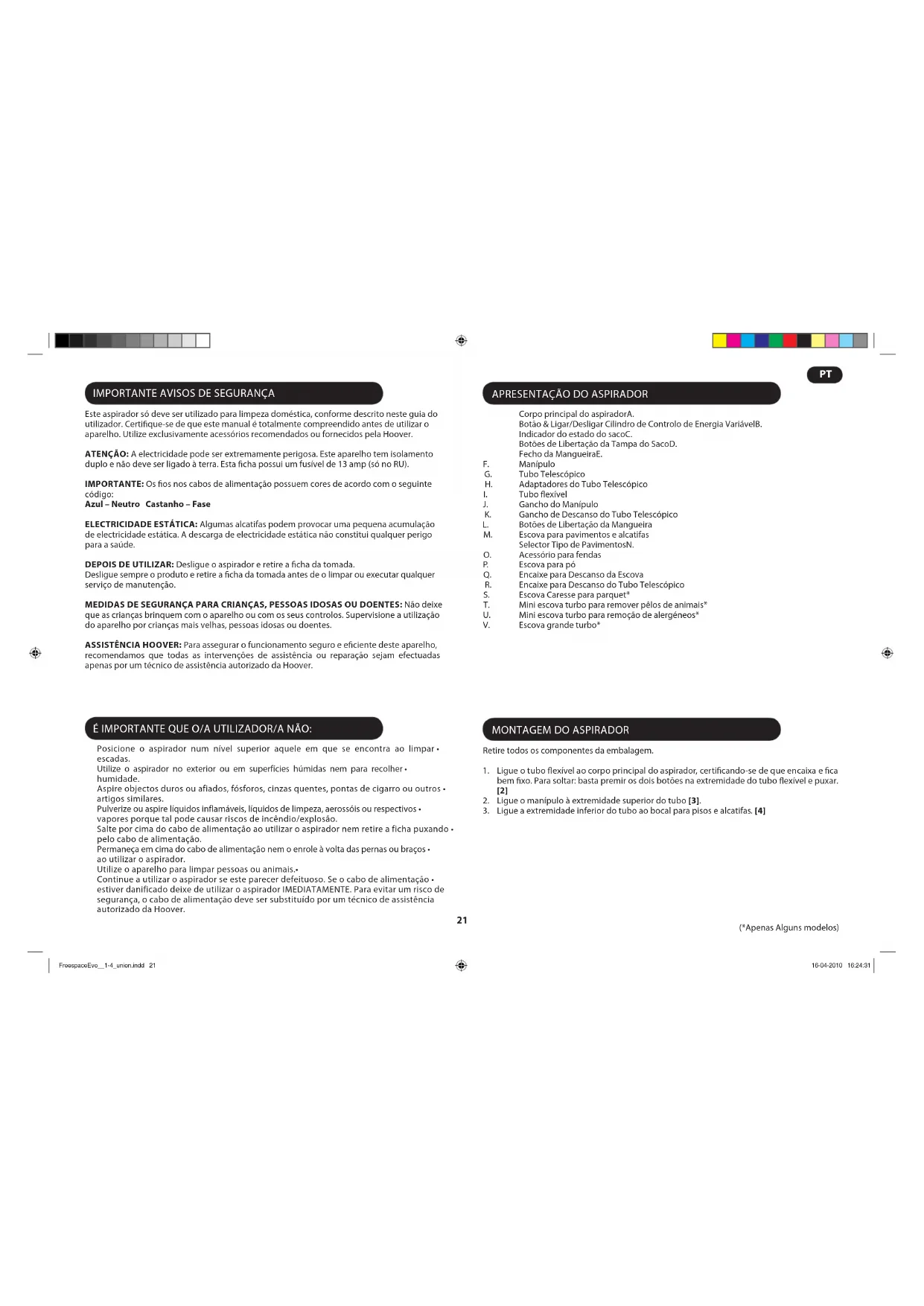 Este aspirador só deve ser utilizado para limpeza doméstica, conforme descrito neste guia do utilizador. Certique-se de que este manual é totalmente compreendido antes de utilizar o aparelho. Utilize exclusivamente acessórios recomendados ou fornecidos pela Hoover. ATENÇÃO: A electricidade pode ser extremamente perigosa. Este aparelho tem isolamento duplo e não deve ser ligado à terra. Esta cha possui um fusível de 13 amp (só no RU). IMPORTANTE: Os os nos cabos de alimentação possuem cores de acordo com o seguinte código: Azul – Neutro Castanho – Fase ELECTRICIDADE ESTÁTICA: Algumas alcatifas podem provocar uma pequena acumulação de electricidade estática. A descarga de electricidade estática não constitui qualquer perigo para a saúde. DEPOIS DE UTILIZAR: Desligue o aspirador e retire a cha da tomada. Desligue sempre o produto e retire a cha da tomada antes de o limpar ou executar qualquer serviço de manutenção. MEDIDAS DE SEGURANÇA PARA CRIANÇAS, PESSOAS IDOSAS OU DOENTES: Não deixe que as crianças brinquem com o aparelho ou com os seus controlos. Supervisione a utilização do aparelho por crianças mais velhas, pessoas idosas ou doentes. ASSISTÊNCIA HOOVER: Para assegurar o funcionamento seguro e eciente deste aparelho, recomendamos que todas as intervenções de assistência ou reparação sejam efectuadas apenas por um técnico de assistência autorizado da Hoover. (*Apenas Alguns modelos)