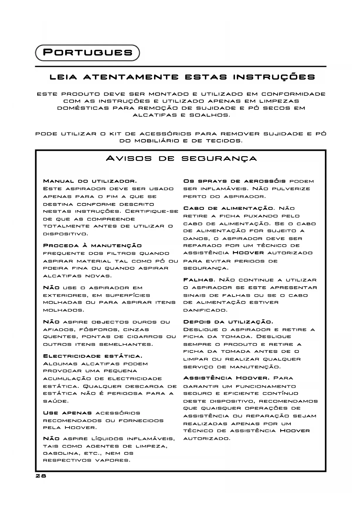 Manual do utilizador. Este aspirador deve ser usado apenas para o fim a que se destina conforme descrito nestas instruções. Certifique-se de que as compreende totalmente antes de utilizar o dispositivo. Proceda à manutenção frequente dos filtros quando aspirar material tal como pó ou poeira fina ou quando aspirar alcatifas novas. Não use o aspirador em exteriores, em superfícies molhadas ou para aspirar itens molhados. Não aspire objectos duros ou afiados, fósforos, cinzas quentes, pontas de cigarros ou outros itens semelhantes. Electricidade estática. Algumas alcatifas podem provocar uma pequena acumulação de electricidade estática. Qualquer descarga de estática não é perigosa para a saúde. Use apenas acessórios recomendados ou fornecidos pela Hoover. Não aspire líquidos inflamáveis, tais como agentes de limpeza, gasolina, etc., nem os respectivos vapores. Os sprays de aerossóis podem ser inflamáveis. Não pulverize perto do aspirador. Cabo de alimentação. Não retire a ficha puxando pelo cabo de alimentação. Se o cabo de alimentação for sujeito a danos, o aspirador deve ser reparado por um técnico de assistência Hoover autorizado para evitar perigos de segurança. Falhas. Não continue a utilizar o aspirador se este apresentar sinais de falhas ou se o cabo de alimentação estiver danificado. Depois da utilização. Desligue o aspirador e retire a ficha da tomada. Desligue sempre o produto e retire a ficha da tomada antes de o limpar ou realizar qualquer serviço de manutenção. Assistência Hoover. Para garantir um funcionamento seguro e eficiente contínuo deste dispositivo, recomendamos que quaisquer operações de assistência ou reparação sejam realizadas apenas por um técnico de assistência HHoooovveerr autorizado.