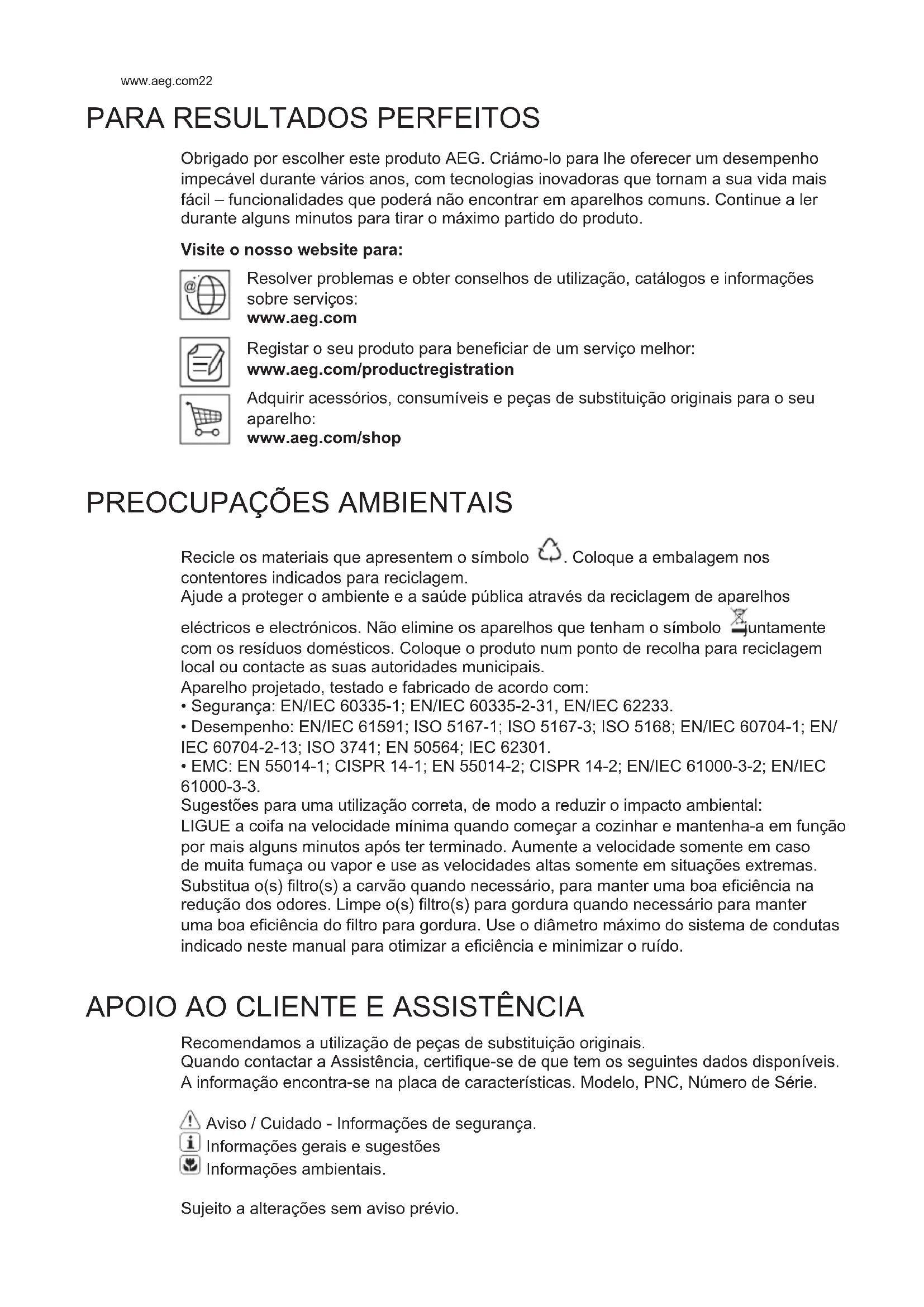 Obrigado por escolher este produto AEG. Criámo-lo para lhe oferecer um desempenho impecável durante vários anos, com tecnologias inovadoras que tornam a sua vida mais fácil – funcionalidades que poderá não encontrar em aparelhos comuns. Continue a ler durante alguns minutos para tirar o máximo partido do produto. Visite o nosso website para: Resolver problemas e obter conselhos de utilização, catálogos e informações sobre serviços: www.aeg.com Registar o seu produto para beneficiar de um serviço melhor: www.aeg.com/productregistration Adquirir acessórios, consumíveis e peças de substituição originais para o seu aparelho: www.aeg.com/shop