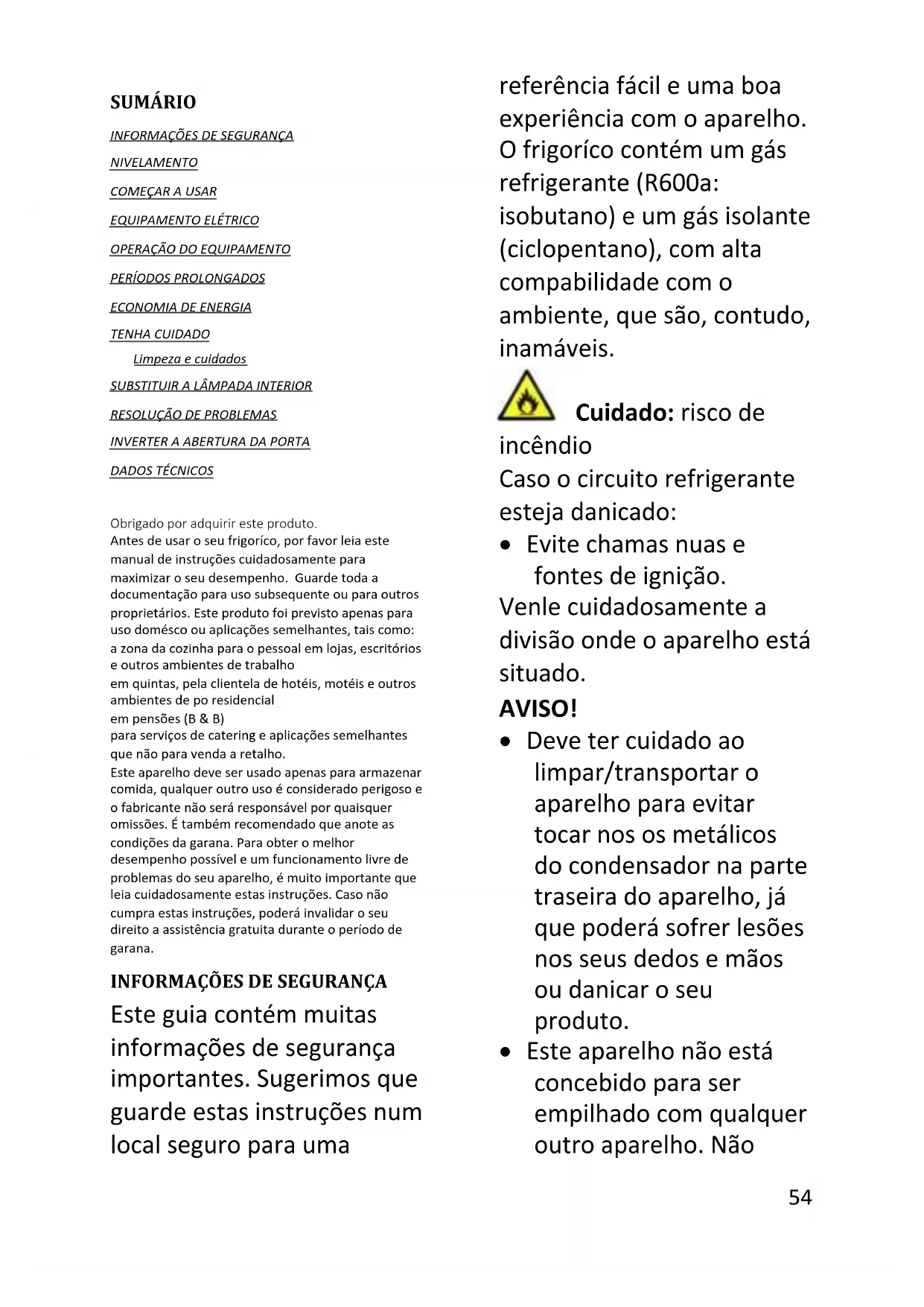 Este guia contém muitas informações de segurança importantes. Sugerimos que guarde estas instruções num local seguro para uma referência fácil e uma boa experiência com o aparelho. O frigorífico contém um gás refrigerante (R600a: isobutano) e um gás isolante (ciclopentano), com alta compatibilidade com o ambiente, que são, contudo, inflamáveis. Cuidado: risco de incêndio Caso o circuito refrigerante esteja danificado: