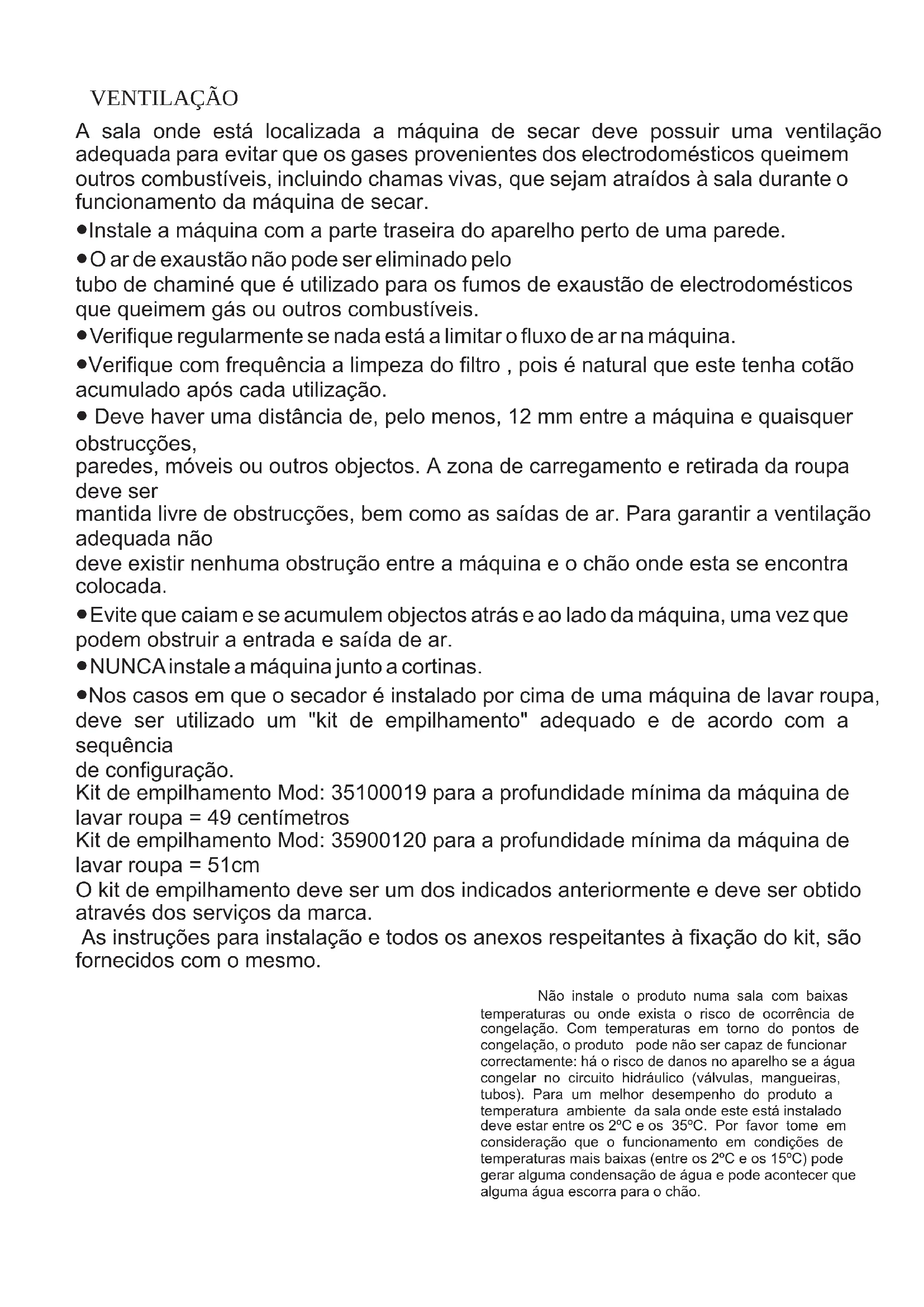 A sala onde está localizada a boaquina de secar deve possuir uma ventilacao adequada para evaporar que os gases provenientes dos electrodomesticos queimemculos combustíveis, incluindo chamas vivas, que sejam atraidos à sala durante ofunçãoamento da boaquina de secar.