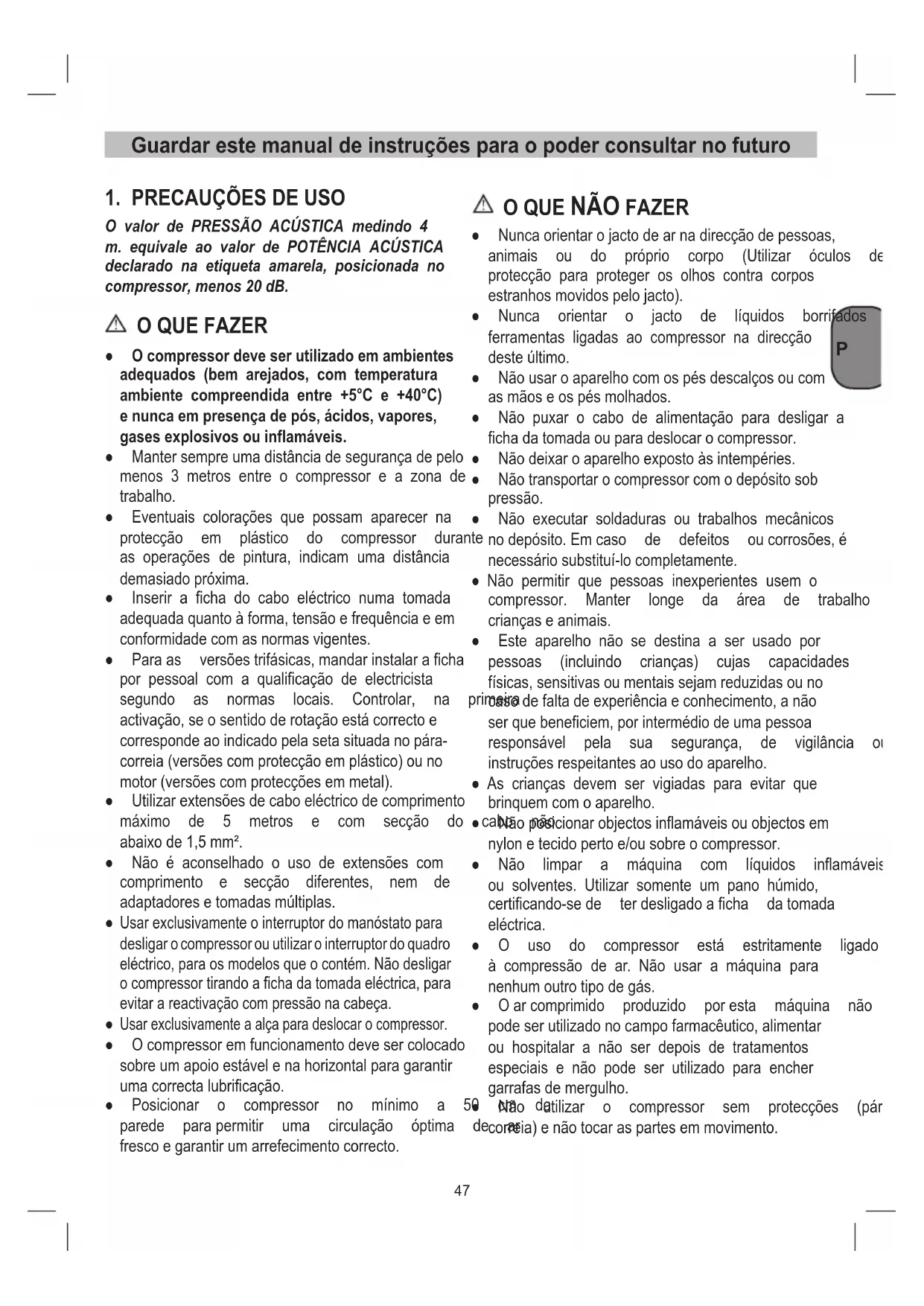 ● Nunca orientar o jacto de ar na direcção de pessoas, animais ou do próprio corpo (Utilizar óculos de protecção para proteger os olhos contra corpos estranhosmovidospelojacto). ● Nunca orientar o jacto de líquidos borrifados por ferramentas ligadas ao compressor na direcção desteúltimo. ● Não usar o aparelho com os pés descalços ou com asmãoseospésmolhados. ● Não puxar o cabo de alimentação para desligar a fichadatomadaouparadeslocarocompressor. ● Nãodeixaroaparelhoexpostoàsintempéries. ● Nãotransportarocompressorcomodepósitosob pressão. ● Não executar soldaduras ou trabalhos mecânicos nodepósito.Emcaso de defeitos oucorrosões,é necessáriosubstituí-locompletamente. ● Não permitir que pessoas inexperientes usem o compressor. Manter longe da área de trabalho criançaseanimais. ● Este aparelho não se destina a ser usado por pessoas (incluindo crianças) cujas capacidades físicas,sensitivasoumentaissejamreduzidasouno casodefaltadeexperiênciaeconhecimento,anão ser que beneficiem, por intermédio de uma pessoa responsável pela sua segurança, de vigilância ou instruçõesrespeitantesaousodoaparelho. ● As crianças devem ser vigiadas para evitar que brinquemcomoaparelho. ● Nãoposicionarobjectosinflamáveisouobjectosem nylonetecidopertoe/ousobreocompressor. ● Não limpar a máquina com líquidos inflamáveis ou solventes. Utilizar somente um pano húmido, certificando-sede terdesligadoaficha datomada eléctrica. ● O uso do compressor está estritamente ligado à compressão de ar. Não usar a máquina para nenhumoutrotipodegás. ● Oarcomprimido produzido poresta máquina não podeserutilizadonocampofarmacêutico,alimentar ou hospitalar a não ser depois de tratamentos especiais e não pode ser utilizado para encher garrafasdemergulho. ● Não utilizar o compressor sem protecções (pára- correia)enãotocaraspartesemmovimento. Guardar este manual de instruções para o poder consultar no futuroP