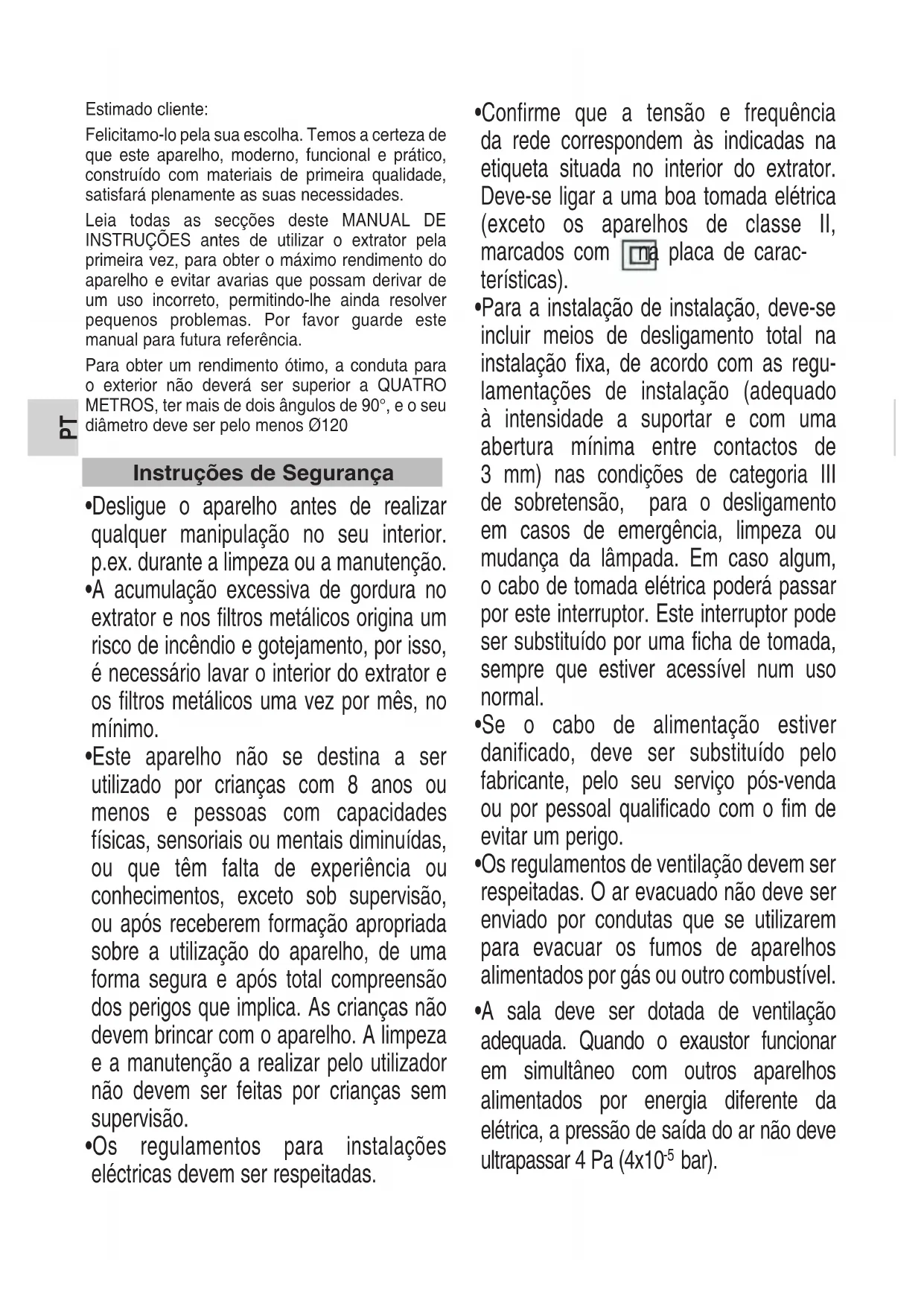 Estimado cliente: Felicitamo-lo pela sua escolha. Temos a certeza de que este aparelho, moderno, funcional e prático, construído com materiais de primeira qualidade, satisfará plenamente as suas necessidades. Leia todas as secções deste MANUAL DE INSTRUÇÕES antes de utilizar o extrator pela primeira vez, para obter o máximo rendimento do aparelho e evitar avarias que possam derivar de um uso incorreto, permitindo-lhe ainda resolver pequenos problemas. Por favor guarde este manual para futura referência. Para obter um rendimento ótimo, a conduta para o exterior não deverá ser superior a QUATRO METROS, ter mais de dois ângulos de 90°, e o seu diâmetro deve ser pelo menos Ø120