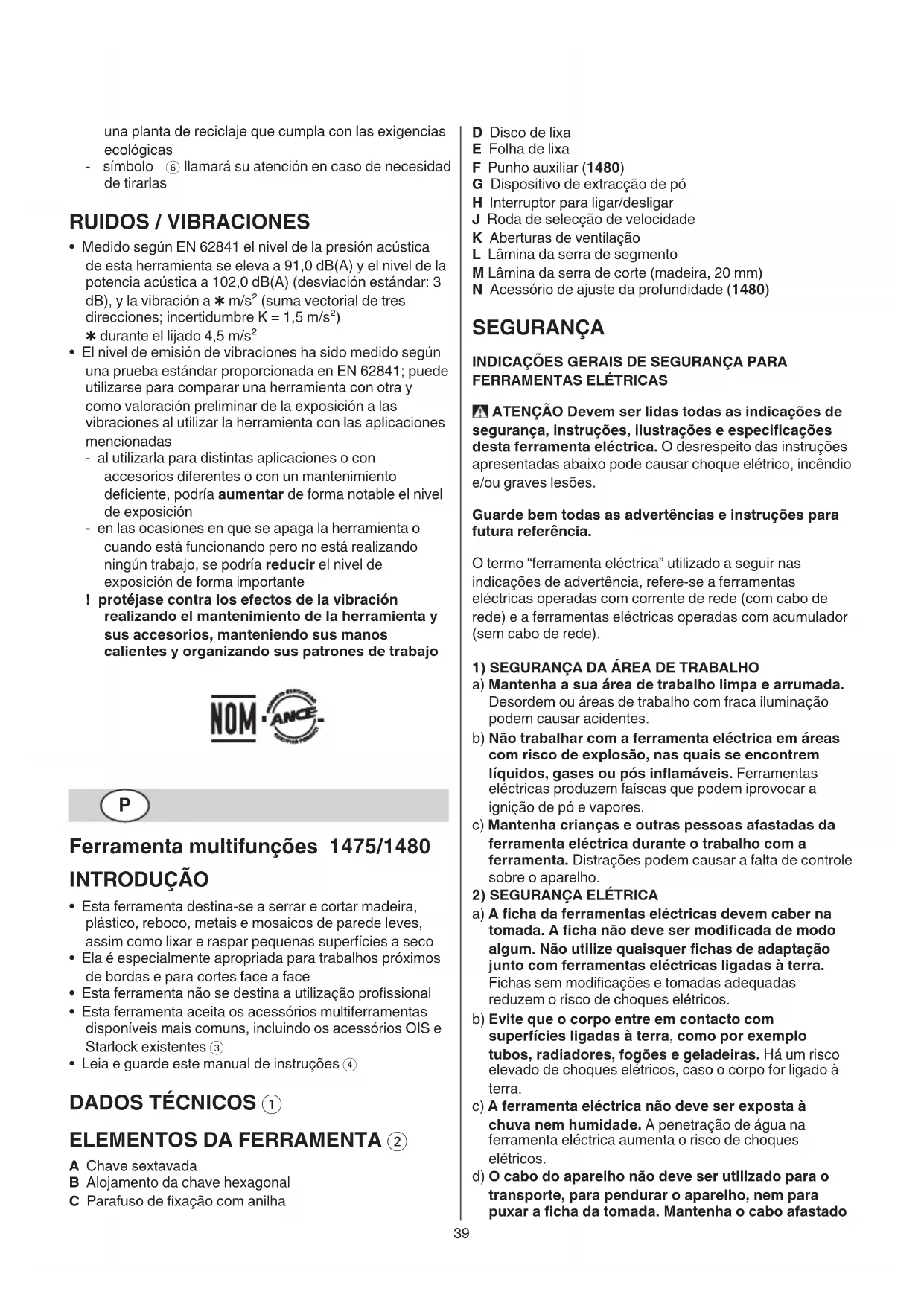 A Chave sextavada B Alojamento da chave hexagonal C Parafuso de xação com anilha D Disco de lixa E Folha de lixa F Punho auxiliar (1480) G Dispositivo de extracção de pó H Interruptor para ligar/desligar J Roda de selecção de velocidade K Aberturas de ventilação L Lâmina da serra de segmento M Lâmina da serra de corte (madeira, 20 mm) N Acessório de ajuste da profundidade (1480) SEGURANÇA INDICAÇÕES GERAIS DE SEGURANÇA PARA