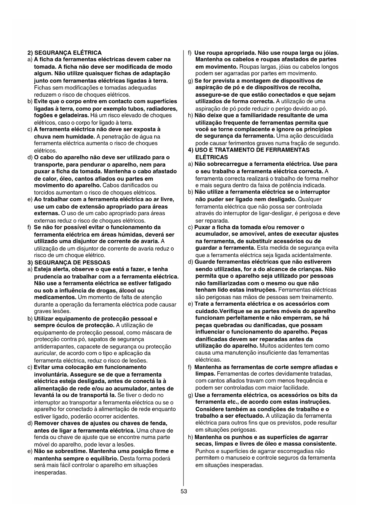 a) Mantenha a sua área de trabalho limpa e arrumada. Desordem ou áreas de trabalho com fraca iluminação podem causar acidentes. b) Não trabalhar com a ferramenta eléctrica em áreas com risco de explosão, nas quais se encontrem líquidos, gases ou pós inflamáveis. Ferramentas eléctricas produzem faíscas que podem iprovocar a ignição de pó e vapores. c) Mantenha crianças e outras pessoas afastadas da ferramenta eléctrica durante o trabalho com a ferramenta. Distrações podem causar a falta de controle sobre o aparelho.53