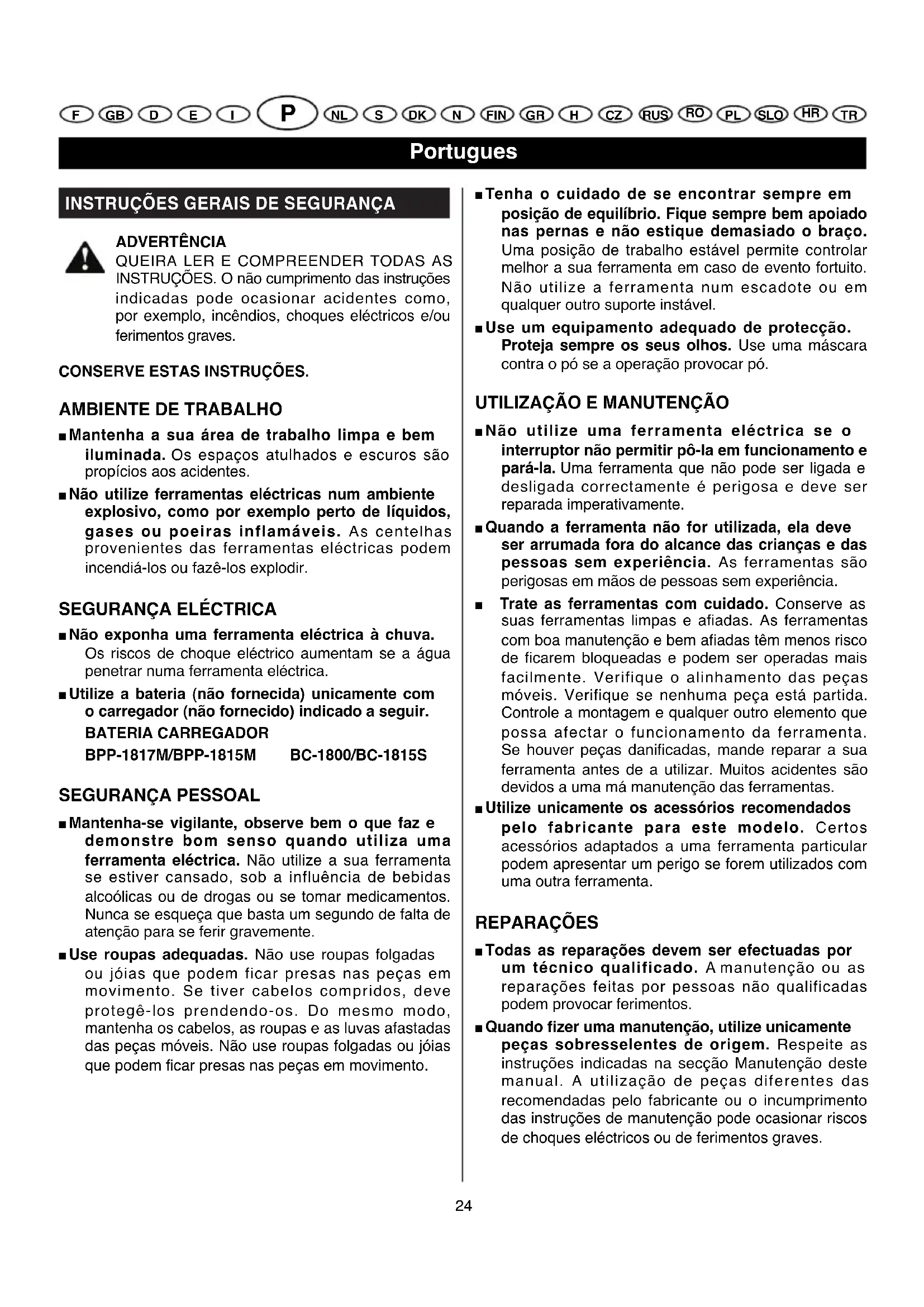 ■ Não utilize uma ferramenta eléctrica se o interruptor não permitir pô-la em funcionamento e pará-la. Uma ferramenta que não pode ser ligada e desligada correctamente é perigosa e deve ser reparada imperativamente. ■ Quando a ferramenta não for utilizada, ela deve ser arrumada fora do alcance das crianças e das pessoas sem experiência. As ferramentas são perigosas em mãos de pessoas sem experiência. ■ Trate as ferramentas com cuidado. Conserve as suas ferramentas limpas e afiadas. As ferramentas com boa manutenção e bem afiadas têm menos risco de ficarem bloqueadas e podem ser operadas mais facilmente. Verifique o alinhamento das peças móveis. Verifique se nenhuma peça está partida. Controle a montagem e qualquer outro elemento que possa afectar o funcionamento da ferramenta. Se houver peças danificadas, mande reparar a sua ferramenta antes de a utilizar. Muitos acidentes são devidos a uma má manutenção das ferramentas. ■ Utilize unicamente os acessórios recomendados pelo fabricante para este modelo. Certos acessórios adaptados a uma ferramenta particular podem apresentar um perigo se forem utilizados com uma outra ferramenta. REPARAÇÕES ■ Todas as reparações devem ser efectuadas por um técnico qualificado. A manutenção ou as reparações feitas por pessoas não qualificadas podem provocar ferimentos. ■ Quando fizer uma manutenção, utilize unicamente peças sobresselentes de origem. Respeite as instruções indicadas na secção Manutenção deste manual. A utilização de peças diferentes das recomendadas pelo fabricante ou o incumprimento das instruções de manutenção pode ocasionar riscos de choques eléctricos ou de ferimentos graves.