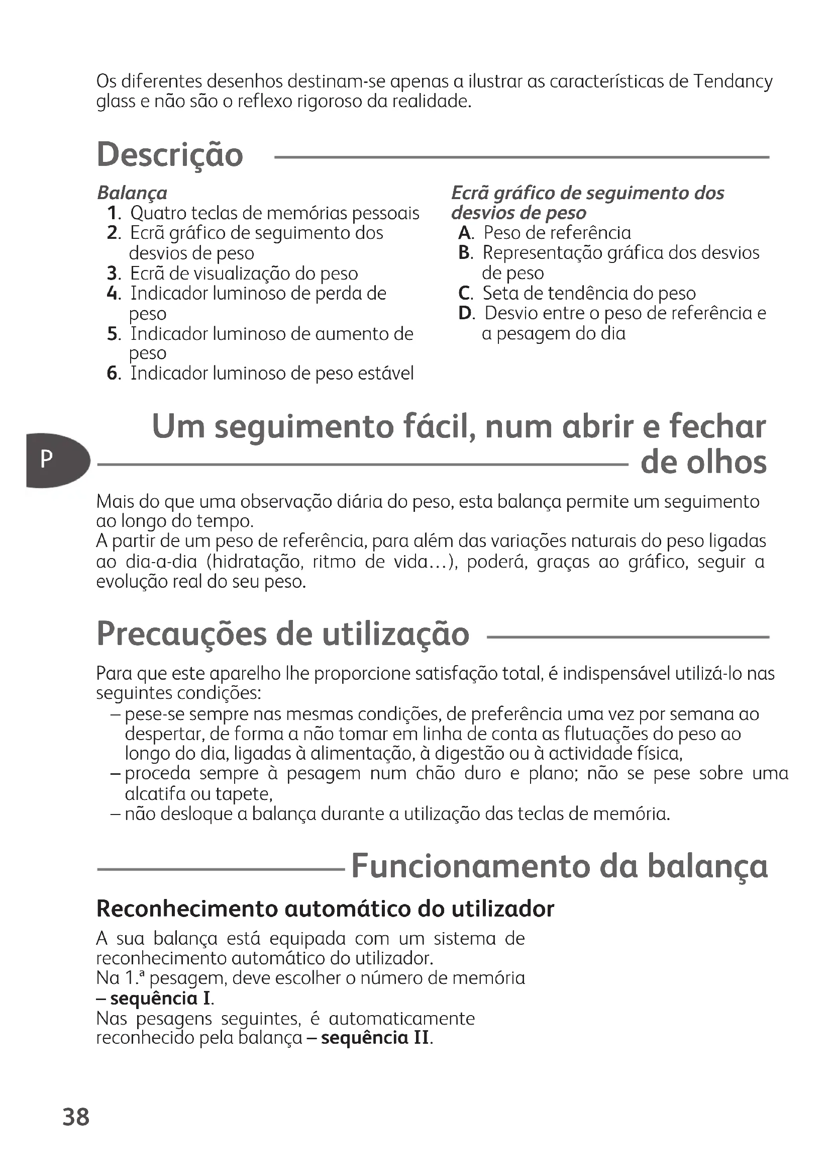 Um seguimento fácil, num abrir e fechar de olhos Mais do que uma observação diária do peso, esta balança permite um seguimentoao longo do tempo. A partir de um peso de referência, para além das variações naturais do peso ligadasao dia-a-dia (hidratação, ritmo de vida…), poderá, graças ao gráfico, seguir aevolução real do seu peso. Precauções de utilização Para que este aparelho lhe proporcione satisfação total, é indispensável utilizá-lo nasseguintes condições:– pese-se sempre nas mesmas condições, de preferência uma vez por semana aodespertar, de forma a não tomar em linha de conta as flutuações do peso aolongo do dia, ligadas à alimentação, à digestão ou à actividade física,– proceda sempre à pesagem num chão duro e plano; não se pese sobre umaalcatifa ou tapete,– não desloque a balança durante a utilização das teclas de memória. Funcionamento da balança Reconhecimento automático do utilizador A sua balança está equipada com um sistema dereconhecimento automático do utilizador.Na 1.ª pesagem, deve escolher o número de memória– sequência I.Nas pesagens seguintes, é automaticamentereconhecido pela balança – sequência II.Ecrã gráfico de seguimento dosdesvios de pesoA. Peso de referênciaB. Representação gráfica dos desviosde pesoC. Seta de tendência do pesoD. Desvio entre o peso de referência ea pesagem do diaF