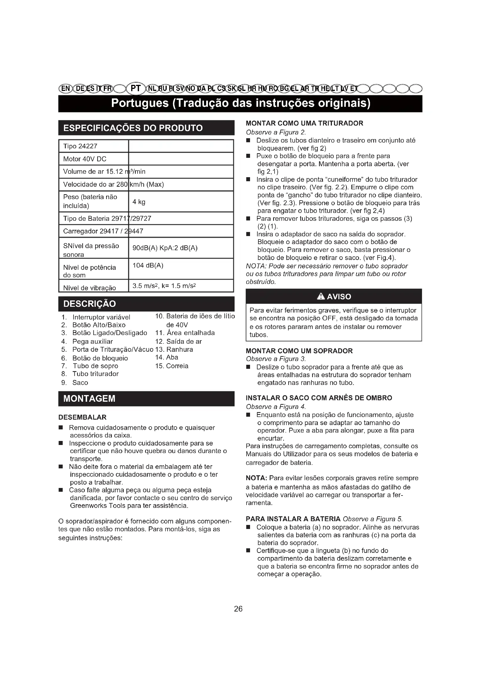 DESCRIÇÃO 1. Interruptor variável2. Botão Alto/Baixo3. Botão Ligado/Desligado4. Pega auxiliar5. Porta de Trituração/Vácuo6. Botão de bloqueio7. Tubo de sopro8. Tubo triturador9. Saco MONTAGEM DESEMBALAR Remova cuidadosamente o produto e quaisquer acessórios da caixa. Inspeccione o produto cuidadosamente para se certificar que não houve quebra ou danos durante o transporte. Não deite fora o material da embalagem até ter inspeccionado cuidadosamente o produto e o ter posto a trabalhar. Caso falte alguma peça ou alguma peça esteja danificada, por favor contacte o seu centro de serviço Greenworks Tools para ter assistência.O soprador/aspirador é fornecido com alguns componen-tes que não estão montados. Para montá-los, siga as seguintes instruções:MONTAR COMO UMA TRITURADOR Observe a Figura 2. Deslize os tubos dianteiro e traseiro em conjunto até bloquearem. (ver fig 2) Puxe o botão de bloqueio para a frente para desengatar a porta. Mantenha a porta aberta. (ver fig 2,1) Insira o clipe de ponta “cuneiforme” do tubo triturador no clipe traseiro. (Ver fig. 2.2). Empurre o clipe com ponta de “gancho” do tubo triturador no clipe dianteiro. (Ver fig. 2.3). Pressione o botão de bloqueio para trás para engatar o tubo triturador. (ver fig 2,4) Para remover tubos trituradores, siga os passos (3) (2) (1). Insira o adaptador de saco na saída do soprador. Bloqueie o adaptador do saco com o botão de bloqueio. Para remover o saco, basta pressionar o botão de bloqueio e retirar o saco. (ver Fig.4). NOTA: Pode ser necessário remover o tubo soprador ou os tubos trituradores para limpar um tubo ou rotor obstruído. AVISO se encontra na posição OFF, está desligado da tomada e os rotores pararam antes de instalar ou remover tubos.MONTAR COMO UM SOPRADOR Observe a Figura 3. Deslize o tubo soprador para a frente até que as áreas entalhadas na estrutura do soprador tenham engatado nas ranhuras no tubo.INSTALAR O SACO COM ARNÊS DE OMBROObserve a Figura 4. Enquanto está na posição de funcionamento, ajuste o comprimento para se adaptar ao tamanho do operador. Puxe a aba para alongar, puxe a fita para encurtar.Para instruções de carregamento completas, consulte os Manuais do Utilizador para os seus modelos de bateria e carregador de bateria.NOTA: Para evitar lesões corporais graves retire sempre a bateria e mantenha as mãos afastadas do gatilho de velocidade variável ao carregar ou transportar a fer-ramenta.PARA INSTALAR A BATERIA Observe a Figura 5. Coloque a bateria (a) no soprador. Alinhe as nervuras salientes da bateria com as ranhuras (c) na porta da bateria do soprador. Certifique-se que a lingueta (b) no fundo do compartimento da bateria deslizam corretamente e que a bateria se encontra firme no soprador antes de começar a operação.10. Bateria de iões de lítio de 40V11. Área entalhada12. Saída de ar13. Ranhura14. Aba15. Correia 26EN DE ES IT FR