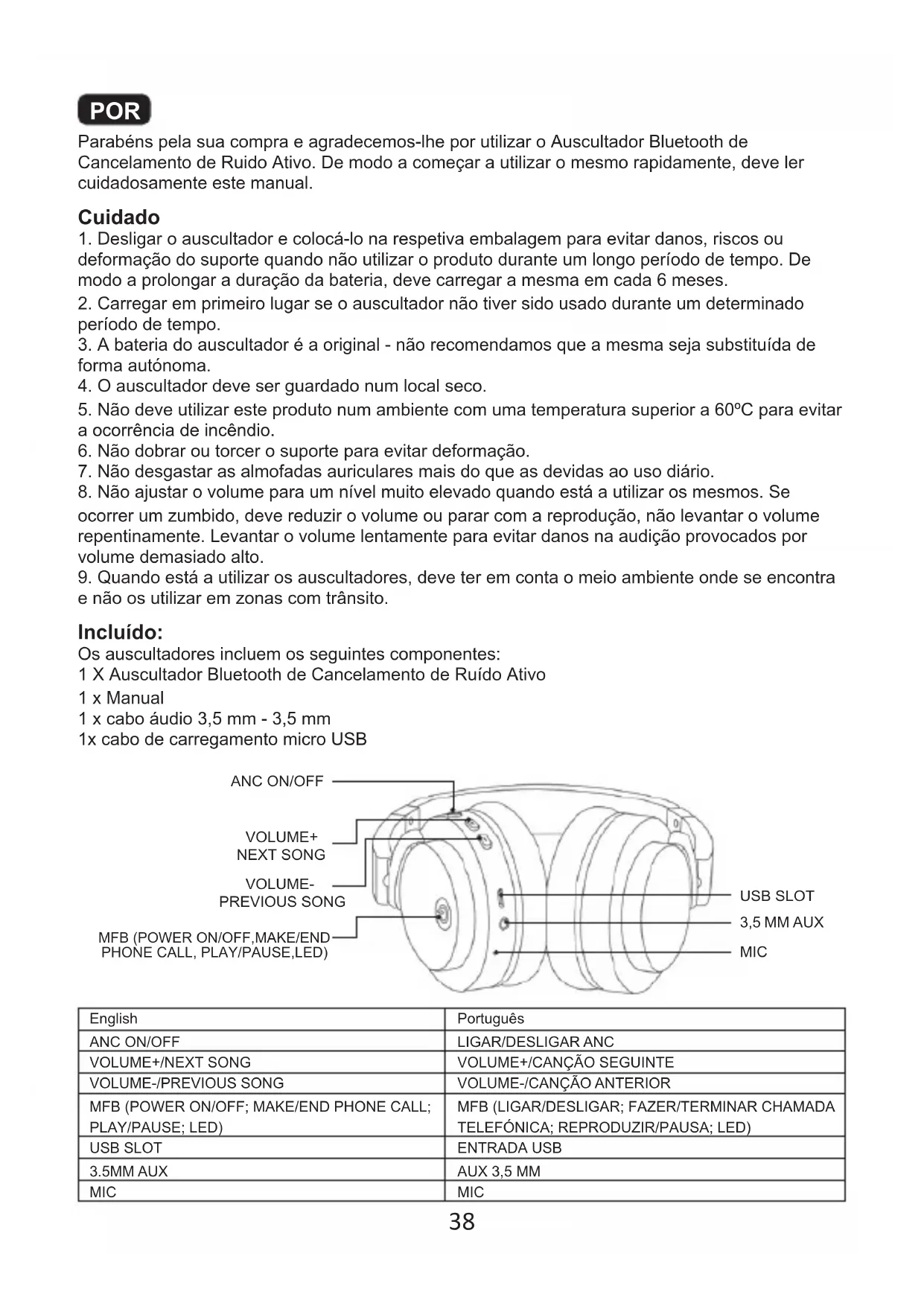 POR39 Chamadas: Para fazer uma chamada, utilizar o seu telemóvel como normalmente faria quando os auscultadores estão ligados ao mesmo. Premir rapidamente e duas vezes o botão MFB para fazer uma chamada para o último número na lista de chamadas. Quando está a receber uma chamada telefónica, premir rapidamente o botão MFB para a atender ou premir demoradamente durante cerca de 1,5 segundos para rejeitar a chamada. A chamada é terminada quando premir deforma breve o botão MFB durante uma chamada. Ouvir música: Para ouvir música, ligar os auscultadores ao seu telefone a um dispositivo Bluettoth compatível que suporte o perfil Bluetooth A2DP. As funções de música disponíveis dependem dos seu dispositivos Bluetooth. Se receber ou fizer uma chamada enquanto está a ouvir música, a música é pausada até a chamada terminar. Para reproduzir uma canção, selecionar o leitor de música e premir a tecla Reproduzir/Pausa nos auscultadores. Para fazer pausa ou retomar a reprodução de uma canção, premir a tecla Reproduzir/Pausa. Para selecionar a canção seguinte durante a reprodução, premir rapidamente a tecla de aumentar o volume. Para selecionar a canção anterior durante a reprodução, premir rapidamente a tecla de baixar o volume. Para aumentar o volume, premir e manter premida a tecla de aumentar o volume, haverá um toque de bipe quando atingir o volume máximo. Para baixar o volume, premir e manter premida a tecla de baixar o volume. (Até ficar sem som) Desligar os auscultadores: Para desligar os auscultadores do seu dispositivo, desligar os auscultadores ou desligar o mesmo no menu Bluetooth do seu dispositivo. Voltar a ligar os auscultadores: Para ligar os auscultadores ao telefone ou ao dispositivo Bluetooth que usou pela última vez com os mesmos, ligar os auscultadores ou fazer uma ligação no menu Bluetooth do seu dispositivo. Modo passivo: Pode usar os BTN-206 como auscultadores com fios para poupar a bateria. Basta ligar um dos terminais do cabo áudio 3,5-3,5 à parte inferior do auricular esquerdo ao seu leitor MP3. Ao inserir um cabo áudio desativa a função sem fios. Aviso de bateria fraca: Na situação de ligado, quando a carga na bateria é inferior a 3.0V será produzido um bipe de aviso em cada 60 segundos. Desligamento na situação de bateria fraca: Quando ligar, quando a carga na bateria for inferior a 2,9 V os auscultadores desligar-se-ão automaticamente. Carregar a Bateria: Os auscultadores incluem um cabo Micro USB que pode ser ligado ao seu computador ou outro dispositivo concebido para o carregamento USB. Ligar o terminal do Micro USB do cabo USB na porta micro USB do conetor do carregador que se encontra no auricular esquerdo dos auscultadores. Ligar a outra extremidade na porta USB no seu computador ou noutros dispositivos concebidos para carregamento USB. A luz indicadora estará vermelha quando está a carregar. Depois de totalmente carregado, a luz do indicador apaga-se. Tempo de carregamento é de cerca de 3 horas com a bateria descarregada. Cancelamento do Ruído Ativo Ligado: Premir e manter premido o botão ANC durante 1 segundo. A luz LED verde irá acender. A função ANC está disponível na situação com fios e sem fios. Cancelamento do Ruído Ativo Desligado: Premir e manter premido o botão ANC durante 1 segundo. A luz LED verde irá apagar-se. A função ANC deve ser desligada manualmente. Ligar o Bluetooth: Para ligar, premir e manter premido o botão MFB durante cerca de 3 segundos Os auscultadores entram no modo de busca de Bluetooth. Luz azul acesa. Desligar o Bluetooth: Para desligar, premir e manter premido o botão MFB durante cerca de 3 segundos Emparelhar: