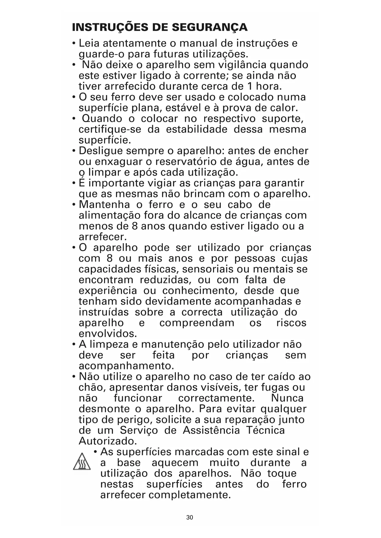 - As superfícies marcadas com este sinal e a base aquecem muito durante a utilização dos aparelhos. Não toque nestas superfícies antes do ferro arrefecer completamente. 1103909940DW8000-DW8100D1_110x22004/02/1308:59Page3031