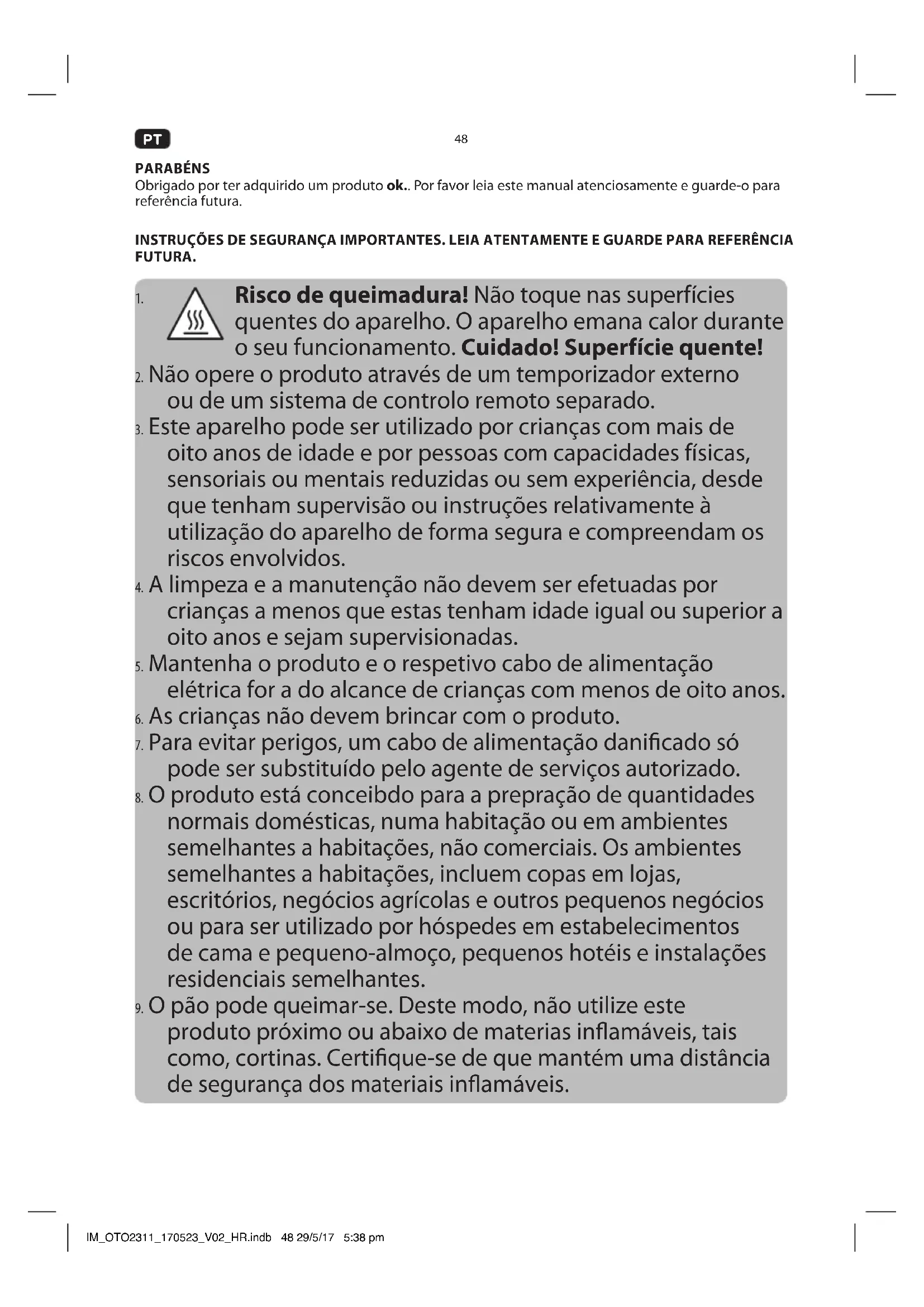 Risco de incendido quando não estiver a utiliser pao normal para torrar. Devido ao tamanho ou forma很小, existe o risco de tocar em partes quentes quando retirar o pao tostado.