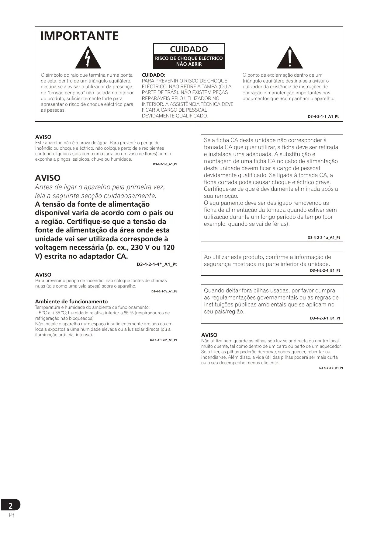 AVISO Este aparelho não é à prova de água. Para prevenir o perigo de incêndio ou choque eléctrico, não coloque perto dele recipientes contendo líquidos (tais como uma jarra ou um vaso de flores) nem o exponha a pingos, salpicos, chuva ou humidade. D3-4-2-1-3_A1_Pt