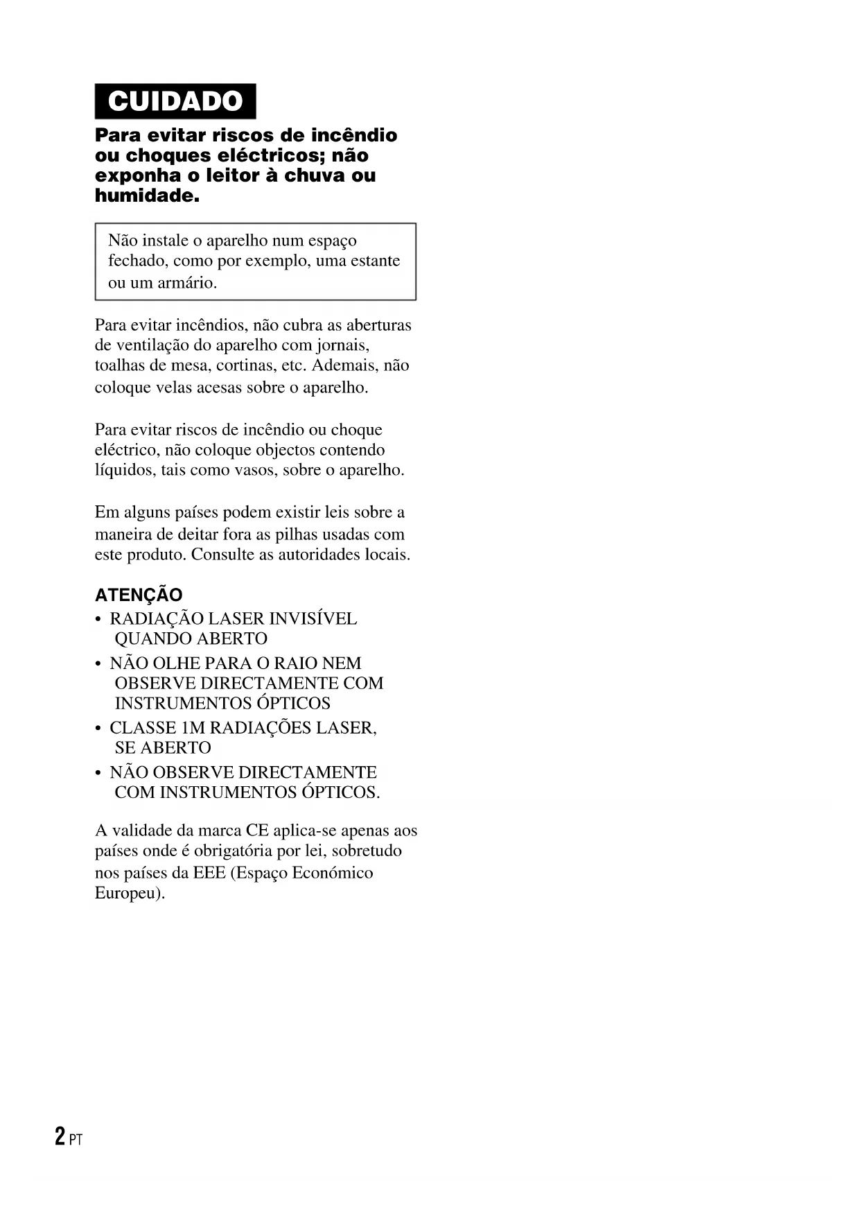 Para evitar riscos de incêndio ou choques eléctricos; não exponha o leitor à chuva ou humidade.