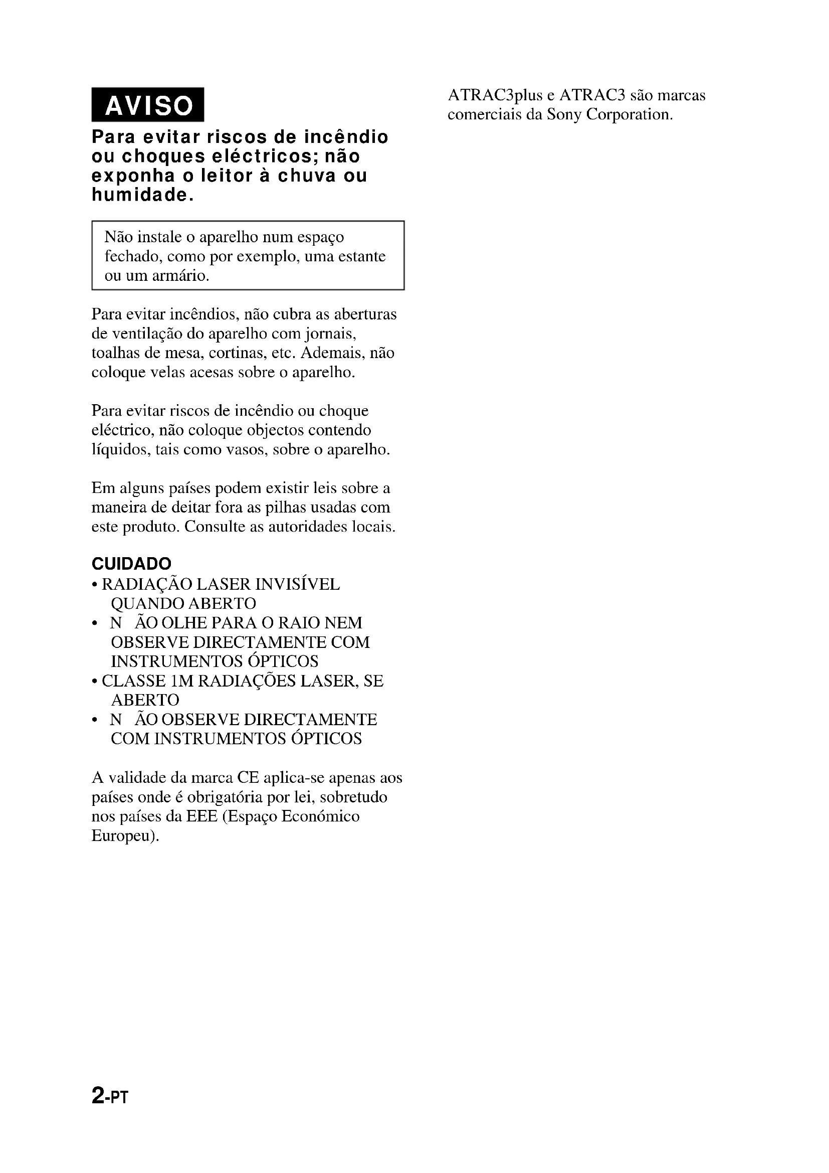 - Las especificaciones respecto a los adaptadores de alimentación de ca varían según cada área. Verifique la tensión de su área y la forma del enchufe antes de comprarlo. **No disponible en Argentina. Es posible que su proveedor no distribuya algunos de los accesorios mencionados. Solicite a su proveedor información detallada sobre los accesorios en su país o región.2-PT ATRAC3plus e ATRAC3 são marcas comerciais da Sony Corporation. AVISO Para evitar riscos de incêndio ou choques eléctricos; não exponha o leitor à chuva ou humidade. Não instale o aparelho num espaço fechado, como por exemplo, uma estante ou um armário. Para evitar incêndios, não cubra as aberturas de ventilação do aparelho com jornais, toalhas de mesa, cortinas, etc. Ademais, não coloque velas acesas sobre o aparelho. Para evitar riscos de incêndio ou choque eléctrico, não coloque objectos contendo líquidos, tais como vasos, sobre o aparelho. Em alguns países podem existir leis sobre a maneira de deitar fora as pilhas usadas com este produto. Consulte as autoridades locais. CUIDADO