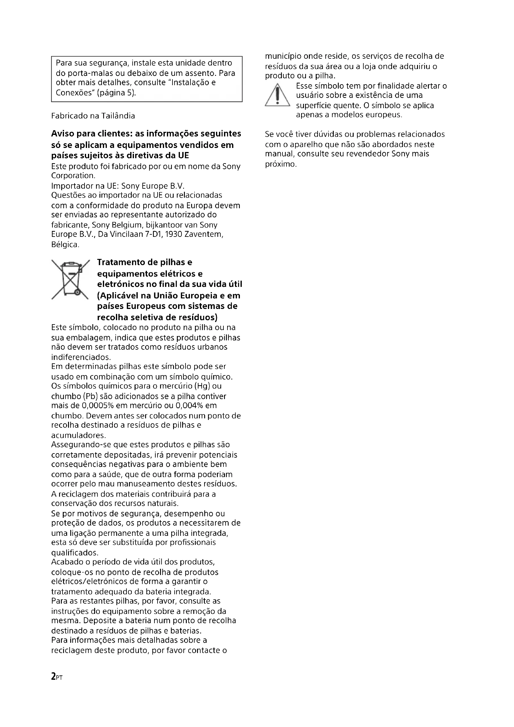 Conexões do Alto-falante Unidade de áudio do automóvel compatível com áudio Hi-Res (ex., RSX-GS9)XM-GS4(esta unidade)Amplificador de potência(ex., XM-GS100)Super tweeter(ex., XS-GS1)Alto-falante de alcance total (ex., XS-GS1621)Subwoofer(ex., XS-GSW121D) Rede cruzadaSuper tweeter frontal (mín. 4 Ω)Alto-falante frontal (mín. 4 Ω)Alto-falante traseiro (mín. 2 Ω)8PT Sistema de 4 alto-falantes Com a conexão de entrada ou (página 6, 7) Sistema de 3 alto-falantes Com a conexão de entrada ou (página 6, 7) Observações Neste sistema, o volume do subwoofer será control ado pelo controle do atenuador da unidade de áudio do automóvel. Neste sistema, os sinais de saída para o subwoofer serão a combinação das saídas REAR L INPUT e REAR R INPUT ou dos sinais do conector de entrada de alto nível REAR. Sistema de 2 vias Com a conexão de entrada ou (página 6, 7) Observação Neste sistema, o volume do subwoofer será controlado pelo contr ole do atenuador da unidade de áudio do automóvel. Sistema de 2 subwoofers Com a conexão de entrada (página 6) Alto-falante frontal (mín. 2 Ω) Alto-falante traseiro (mín. 2 Ω) Alto-falantes Full Range (mín. 2 Ω) Subwoofer (mín. 4 Ω) Alto-falantes Full Range (mín. 2 Ω) Subwoofer (mín. 2 Ω) Subwoofer (mín. 4 Ω)9PT Precauções Esta unidade foi projetada para aterramento negativo de 12 V CC. Utilize alto-falantes com uma impedância de 2 a 8 Ω (d e 4 a 8 Ω quando usado como um amplific ador em ponte). Não ligue nenhum sistema de alto-falantes ativos (com amplif icadores integrados) aos terminais dos alto-falantes da unidade. Isso pode danificar os alto-falantes ativos. Evite instalar a unidade em locais sujeitos a: altas temperaturas, como a da luz solar direta ou do ar quente do aquecedor chuva ou umidade poeira ou sujeira. Se o seu automóvel estiver estacionado ao sol, e houver um aumento c onsiderável da temperatura no interior do automóvel, deixe a unidade esfriar antes de usar.
