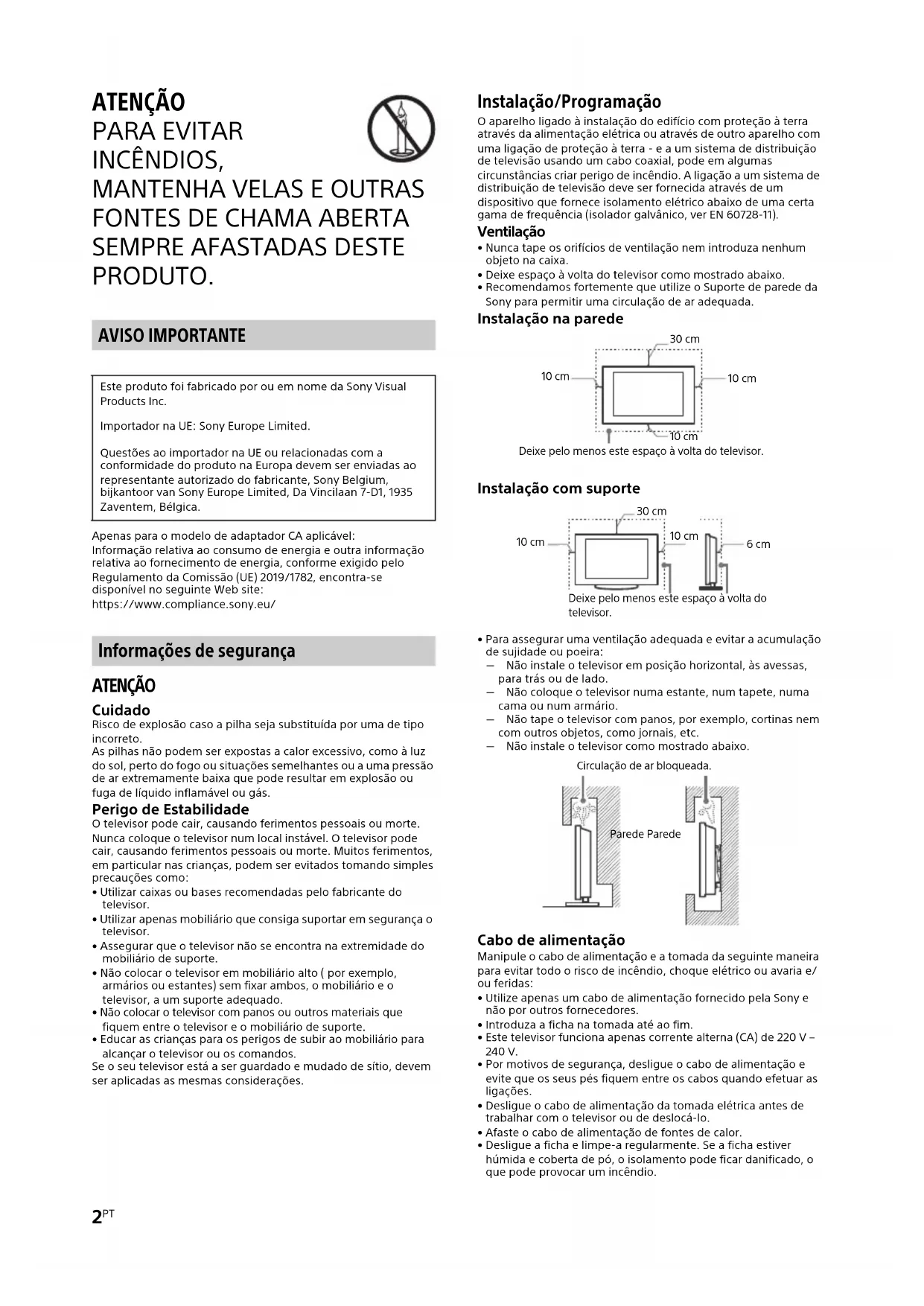 PRODUTO. AVISO IMPORTANTE Apenas para o modelo de adaptador CA aplicável: Informação relativa ao consumo de energia e outra informação relativa ao fornecimento de energia, conforme exigido pelo Regulamento da Comissão (UE) 2019/1782, encontra-se disponível no seguinte Web site: https://www.compliance.sony.eu/ Informações de segurança ATENÇÃO Cuidado Risco de explosão caso a pilha seja substituída por uma de tipo incorreto. As pilhas não podem ser expostas a calor excessivo, como à luz do sol, perto do fogo ou situações semelhantes ou a uma pressão de ar extremamente baixa que pode resultar em explosão ou fuga de líquido inflamável ou gás. Perigo de Estabilidade O televisor pode cair, causando ferimentos pessoais ou morte. Nunca coloque o televisor num local instável. O televisor pode cair, causando ferimentos pessoais ou morte. Muitos ferimentos, em particular nas crianças, podem ser evitados tomando simples precauções como:
