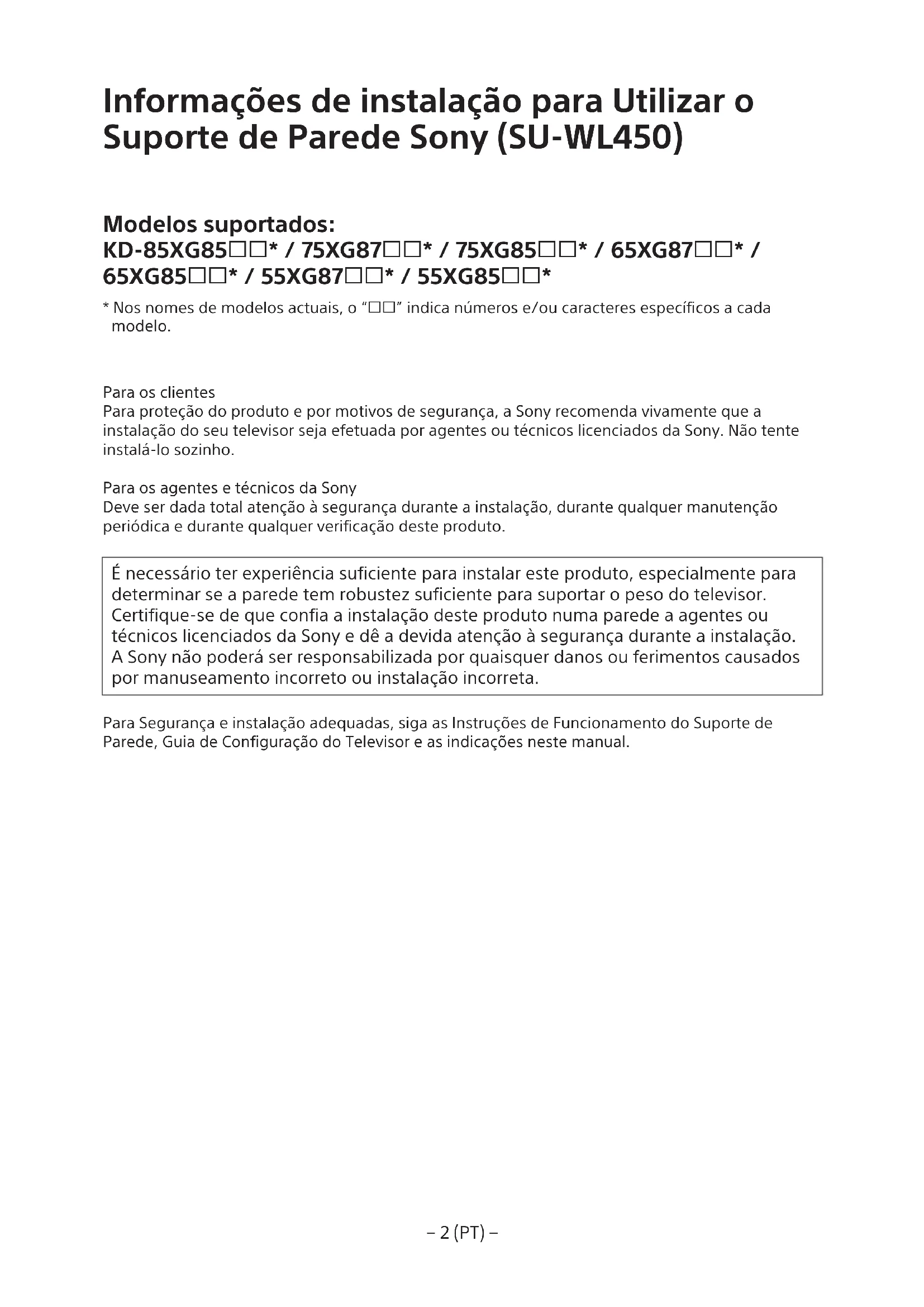 - Nos nomes de modelos actuais, o “” indica números e/ou caracteres específicos a cada modelo. Para os clientes Para proteção do produto e por motivos de segurança, a Sony recomenda vivamente que a instalação do seu televisor seja efetuada por agentes ou técnicos licenciados da Sony. Não tente instalá-lo sozinho. Para os agentes e técnicos da Sony Deve ser dada total atenção à segurança durante a instalação, durante qualquer manutenção periódica e durante qualquer verificação deste produto. É necessário ter experiência suficiente para instalar este produto, especialmente para determinar se a parede tem robustez suficiente para suportar o peso do televisor. Certifique-se de que confia a instalação deste produto numa parede a agentes ou técnicos licenciados da Sony e dê a devida atenção à segurança durante a instalação. A Sony não poderá ser responsabilizada por quaisquer danos ou ferimentos causados por manuseamento incorreto ou instalação incorreta. Para Segurança e instalação adequadas, siga as Instruções de Funcionamento do Suporte de Parede, Guia de Configuração do Televisor e as indicações neste manual.− 3 (PT) −