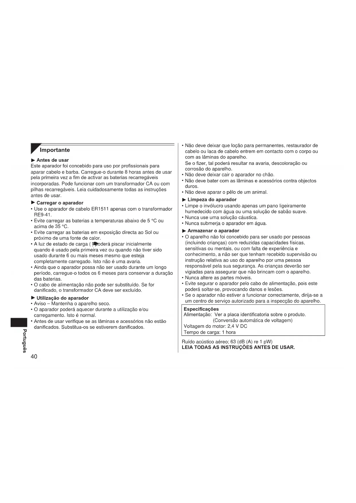 Não deve deixar que loção para permanentes, restaurador de cabelo ou laca de cabelo entrem em contacto com o corpo ou com as lâminas do aparelho. Se o zer, tal poderá resultar na avaria, descoloração ou corrosão do aparelho. Não deve deixar cair o aparador no chão. Não deve bater com as lâminas e acessórios contra objectos duros. Não deve aparar o pêlo de um animal. Limpeza do aparador Limpe o invólucro usando apenas um pano ligeiramente humedecido com água ou uma solução de sabão suave. Nunca use uma solução cáustica. Nunca submerja o aparador em água. Armazenar o aparador O aparelho não foi concebido para ser usado por pessoas (incluindo crianças) com reduzidas capacidades físicas, sensitivas ou mentais, ou com falta de experiência e conhecimento, a não ser que tenham recebido supervisão ou instrução relativa ao uso do aparelho por uma pessoa responsável pela sua segurança. As crianças deverão ser vigiadas para assegurar que não brincam com o aparelho. Nunca altere as partes móveis. Evite segurar o aparador pelo cabo de alimentação, pois este poderá soltar ‑se, provocando danos e lesões. Se o aparador não estiver a funcionar correctamente, dirija‑se a um centro de serviço autorizado para a inspecção do aparelho. Especicações Alimentação: Ver a placa identicatoria sobre o produto. (Conversão automática de voltagem) Voltagem do motor: 2,4 V DC Tempo de carga: 1 hora Ruído acústico aéreo; 63 (dB (A) re 1 pW) LEIA TODAS AS INSTRUÇÕES ANTES DE USAR.
