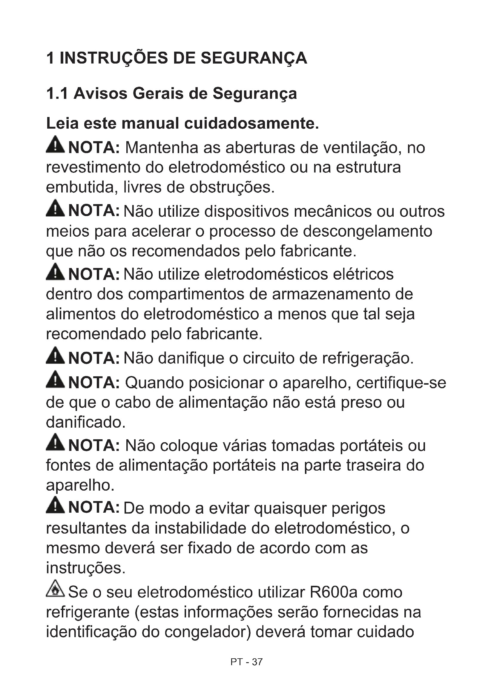 Leia este manual cuidadosamente. NOTA: Mantenha as aberturas de ventilação, no revestimento do eletrodoméstico ou na estrutura embutida, livres de obstruções. NOTA: Não utilize dispositivos mecânicos ou outros meios para acelerar o processo de descongelamento que não os recomendados pelo fabricante. NOTA: Não utilize eletrodomésticos elétricos dentro dos compartimentos de armazenamento de alimentos do eletrodoméstico a menos que tal seja recomendado pelo fabricante. NOTA: Não danique o circuito de refrigeração. NOTA: Quando posicionar o aparelho, certique-se de que o cabo de alimentação não está preso ou danicado. NOTA: Não coloque várias tomadas portáteis ou fontes de alimentação portáteis na parte traseira do aparelho. NOTA: De modo a evitar quaisquer perigos resultantes da instabilidade do eletrodoméstico, o mesmo deverá ser xado de acordo com as instruções. Se o seu eletrodoméstico utilizar R600a como refrigerante (estas informações serão fornecidas na identicação do congelador) deverá tomar cuidadoPT - 38 durante o transportee instalação para evitar que elementos do congelador quem danicados. O R600a é amigo do ambiente e um gás natural, no entanto, explosivo. Na eventualidade de uma fuga devido a danos dos elementos do congelador, afaste o seu frigoríco de chamas vivas ou fontes de calor e ventile, durante alguns minutos, a divisão onde se localiza o frigoríco.