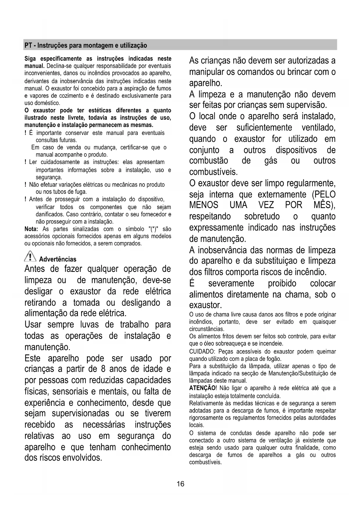 Si la iluminación no funciona, antes de llamar al servicio de asistencia técnica, revisar que las lámparas estén correctamente instaladas. - Modelo con lámparas LED La campana viene provista de un sistema de iluminación basado en la tecnología LED. Los LEDS garantizan una óptima iluminación, una duración hasta 10 veces mayor de las lámparas tradicionales y permiten aborra el 90% de energía eléctrica. . Para la sustitución dirigirse al servicio asistencia técnica .16 PT - Instruções para montagem e utilização Siga especificamente as instruções indicadas neste manual. Declina-se qualquer responsabilidade por eventuais inconvenientes, danos ou incêndios provocados ao aparelho, derivantes da inobservância das instruções indicadas neste manual. O exaustor foi concebido para a aspiração de fumos e vapores de cozimento e é destinado exclusivamente para uso doméstico. O exaustor pode ter estéticas diferentes a quanto ilustrado neste livrete, todavia as instruções de uso, manutenção e instalação permanecem as mesmas. ! É importante conservar este manual para eventuais consultas futuras. Em caso de venda ou mudança, certificar-se que o manual acompanhe o produto. ! Ler cuidadosamente as instruções: elas apresentam importantes informações sobre a instalação, uso e segurança. ! Não efetuar variações elétricas ou mecânicas no produto ou nos tubos de fuga. ! Antes de prosseguir com a instalação do dispositivo, verificar todos os componentes que não sejam danificados. Caso contrário, contatar o seu fornecedor e não prosseguir com a instalação. Nota: As partes sinalizadas com o símbolo "(*)" são acessórios opcionais fornecidos apenas em alguns modelos ou opcionais não fornecidos, a serem comprados. Advertências Antes de fazer qualquer operação de limpeza ou de manutenção, deve-se desligar o exaustor da rede elétrica retirando a tomada ou desligando a alimentação da rede elétrica. Usar sempre luvas de trabalho para todas as operações de instalação e manutenção. Este aparelho pode ser usado por crianças a partir de 8 anos de idade e por pessoas com reduzidas capacidades físicas, sensoriais e mentais, ou falta de experiência e conhecimento, desde que sejam supervisionadas ou se tiverem recebido as necessárias instruções relativas ao uso em segurança do aparelho e que tenham conhecimento dos riscos envolvidos. As crianças não devem ser autorizadas a manipular os comandos ou brincar com o aparelho. A limpeza e a manutenção não devem ser feitas por crianças sem supervisão. O local onde o aparelho será instalado, deve ser suficientemente ventilado, quando o exaustor for utilizado em conjunto a outros dispositivos de combustão de gás ou outros combustíveis. O exaustor deve ser limpo regularmente, seja interna que externamente (PELO MENOS UMA VEZ POR MÊS), respeitando sobretudo o quanto expressamente indicado nas instruções de manutenção. A inobservância das normas de limpeza do aparelho e da substituiçao e limpeza dos filtros comporta riscos de incêndio. É severamente proibido colocar alimentos diretamente na chama, sob o exaustor. O uso de chama livre causa danos aos filtros e pode originar incêndios, portanto, deve ser evitado em quaisquer circunstâncias. Os alimentos fritos devem ser feitos sob controle, para evitar que o óleo sobreaqueça e se incendeie. CUIDADO: Peças acessíveis do exaustor podem queimar quando utilizado com a placa de fogão. Para a substituição da lâmpada, utilizar apenas o tipo de lâmpada indicado na secção de Manutenção/Substituição de lâmpadas deste manual. ATENÇÃO! Não ligar o aparelho à rede elétrica até que a instalação esteja totalmente concluída. Relativamente às medidas técnicas e de segurança a serem adotadas para a descarga de fumos, é importante respeitar rigorosamente os regulamentos fornecidos pelas autoridades locais. O sistema de condutas desde aparelho não pode ser conectado a outro sistema de ventilação já existente que esteja sendo usado para qualquer outra finalidade, como descarga de fumos de aparelhos a gás ou outros combustíveis.17 Não utilizar ou deixar o exaustor sem lâmpadas corretamente montadas, devido ao possível risco de choques elétricos. Nunca utilizar o exaustor sem as grades montadas corretamente. O exaustor NUNCA deve ser utilizado como uma superfície de apoio, a menos que não seja especificamente indicado. Usar somente os parafusos de fixação fornecidos com o aparelho, para a instalação, ou, se não for fornecido, comprar o tipo de parafuso correto. Usar o comprimento correto para os parafusos que são identificados no Guia de Instalação. Em caso de dúvida, consultar um centro de assistência autorizado ou pessoa qualificada similar. ATENÇÃO! A falta de instalação de parafusos ou dispositivos de fixação em conformidade com estas instruções, pode resultar em riscos elétricos. Este aparelho está classificado de acordo com a Diretiva Europeia 2012/19/EC sobre Resíduos de equipamento elétrico e eletrónico (REEE). Ao garantir a eliminação adequada deste produto, estará a ajudar a evitar potenciais consequências negativas para o ambiente e para a saúde pública, que poderiam derivar de um manuseamento de dispersão inadequada deste produto. O símbolo no produto ou nos documentos que acompanham o produto, indica que este aparelho não pode receber um tratamento semelhante ao de uma dispersão doméstica. Pelo contrário, deverá ser depositado no respectivo centro de recolha para a reciclagem de equipamento elétrico e eletrónico. A eliminação deverá ser efetuada em conformidade com as normas ambientais locais para a eliminação de desperdícios. Para obter informações mais detalhadas sobre o tratamento, a recuperação e a reciclagem deste produto, contate o Departamento na sua localidade, o seu serviço de eliminação de desperdícios domésticos ou a loja onde adquiriu o produto. A