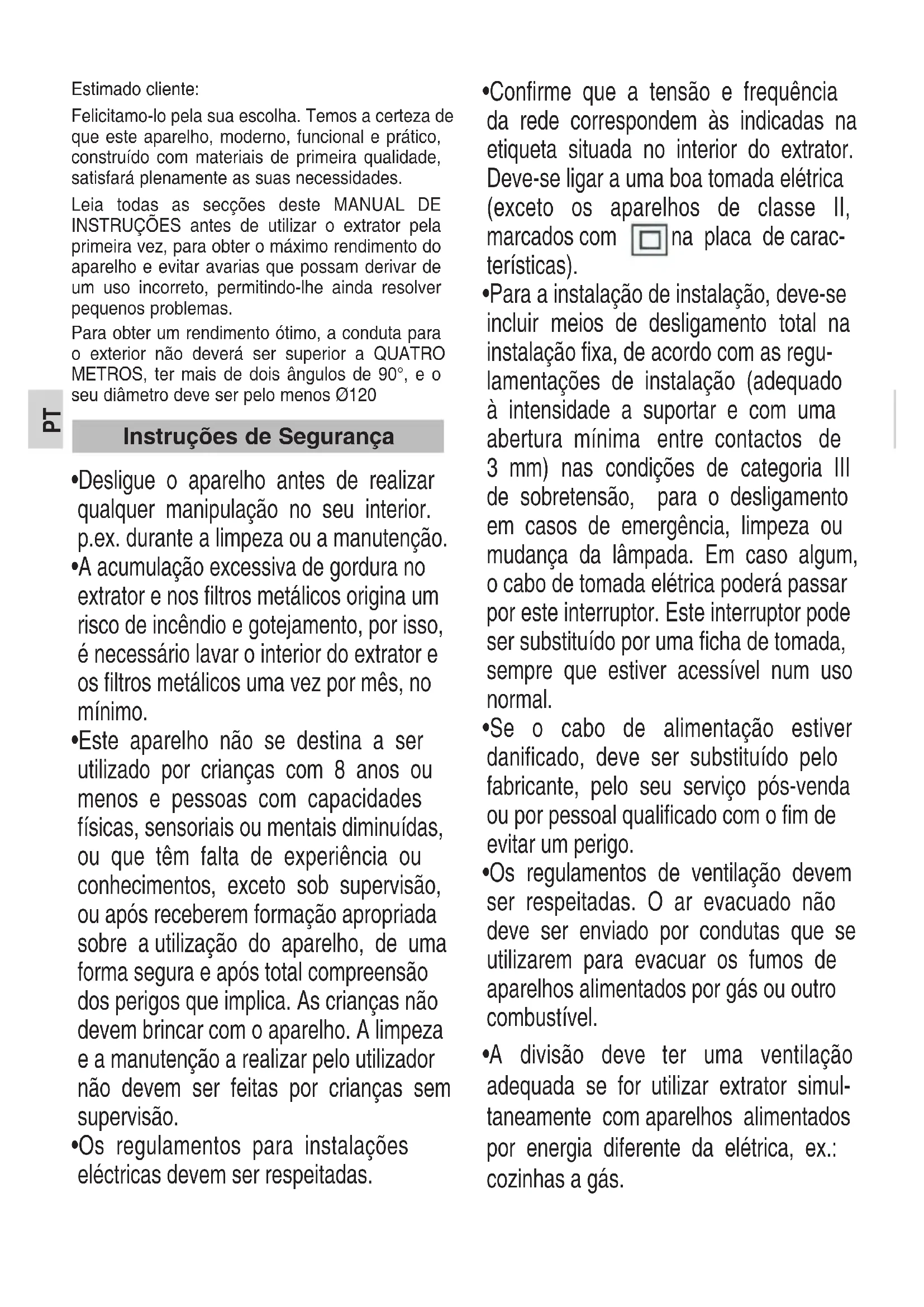 - A divisão deve ter uma ventilação adequada se for utilizar extrator simul- taneamente com aparelhos alimentados por energia diferente da elétrica, ex.: cozinhas a gás. Instruções de SegurançaPT