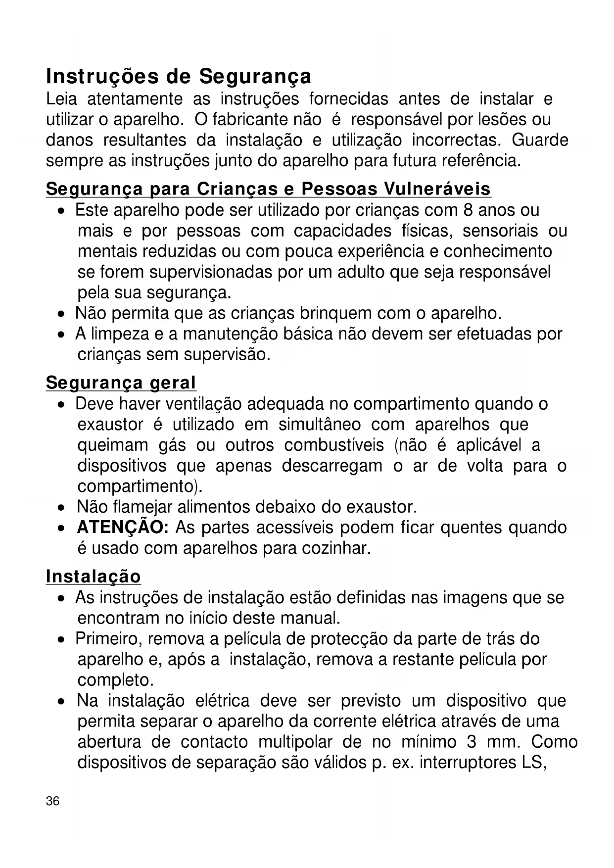 - Na instalação elétrica deve ser previsto um dispositivo que permita separar o aparelho da corrente elétrica através de uma abertura de contacto multipolar de no mínimo 3 mm. Como dispositivos de separação são válidos p. ex. interruptores LS,37