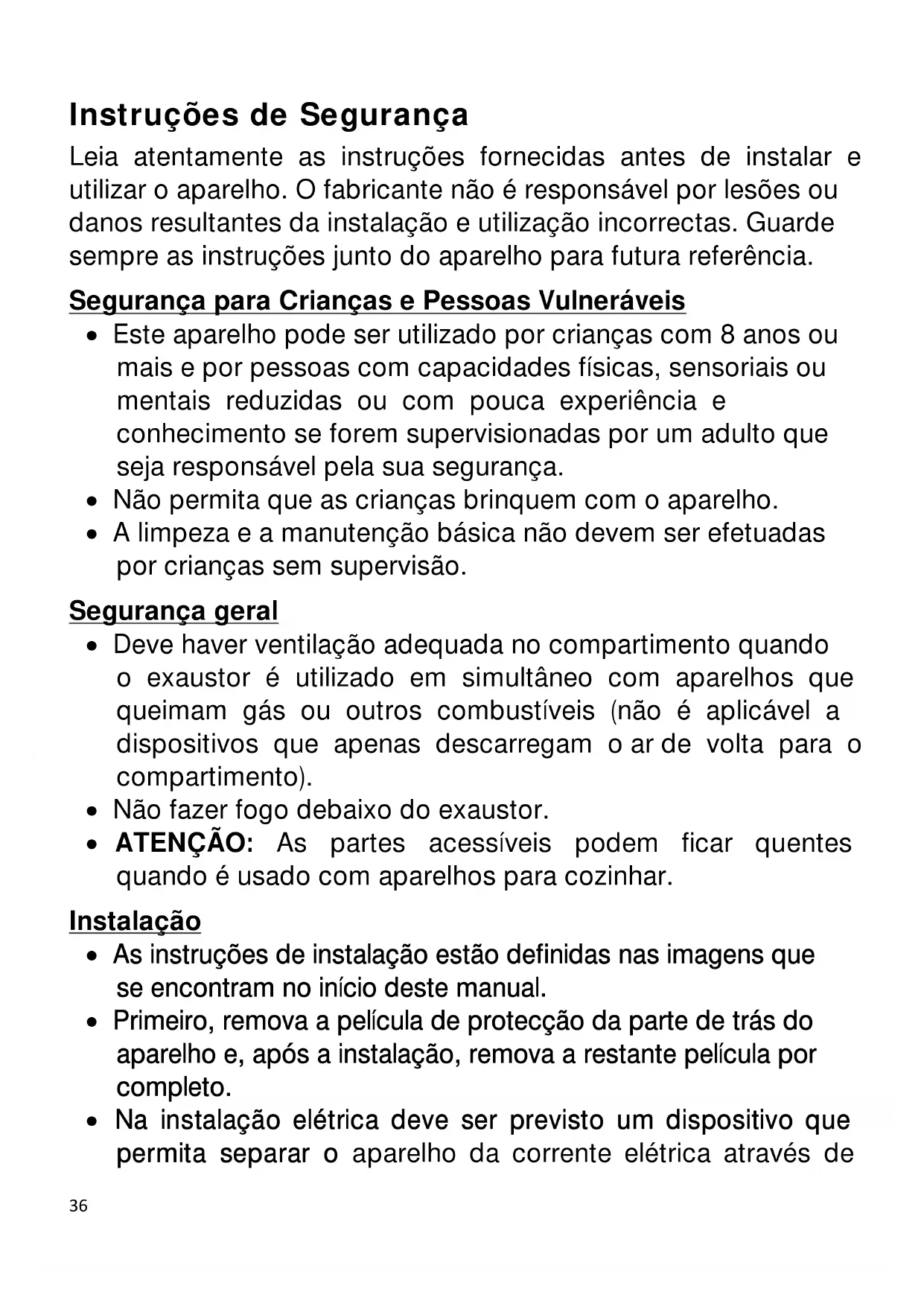- Deve haver ventilação adequada no compartimento quando o exaustor é utilizado em simultâneo com aparelhos que queimam gás ou outros combustíveis (não é aplicável a dispositivos que apenas descarregam o ar de volta para o compartimento).