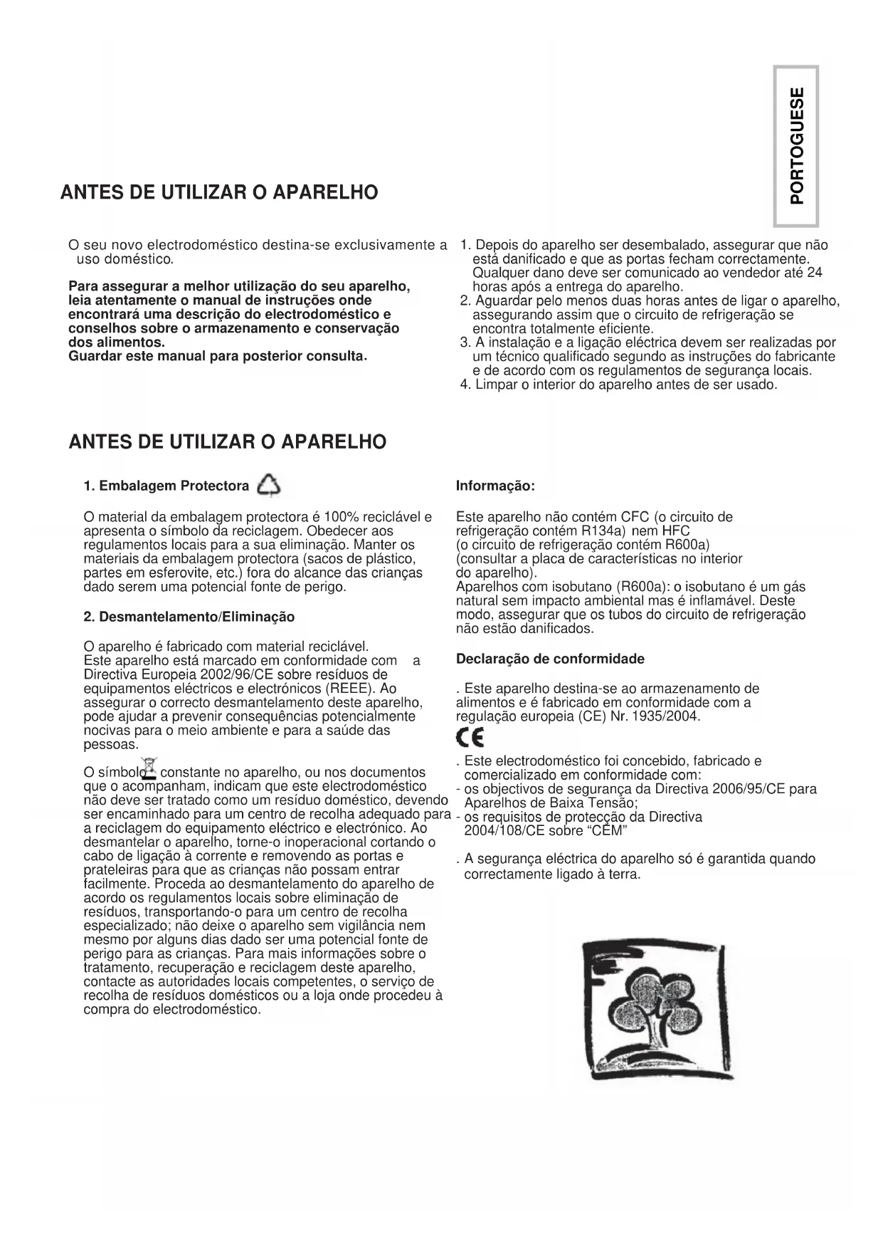 Desmantelamento/Eliminação O aparelho é fabricado com material reciclável. Este aparelho está marcado em conformidade com a Directiva Europeia 2002/96/CE sobre resíduos de equipamentos eléctricos e electrónicos (REEE). Ao assegurar o correcto desmantelamento deste aparelho, pode ajudar a prevenir consequências potencialmente nocivas para o meio ambiente e para a saúde das pessoas. O símbolo constante no aparelho, ou nos documentos que o acompanham, indicam que este electrodoméstico não deve ser tratado como um resíduo doméstico, devendo ser encaminhado para um centro de recolha adequado para a reciclagem do equipamento eléctrico e electrónico. Ao desmantelar o aparelho, torne-o inoperacional cortando o cabo de ligação à corrente e removendo as portas e prateleiras para que as crianças não possam entrar facilmente. Proceda ao desmantelamento do aparelho de acordo os regulamentos locais sobre eliminação de resíduos, transportando-o para um centro de recolha especializado; não deixe o aparelho sem vigilância nem mesmo por alguns dias dado ser uma potencial fonte de perigo para as crianças. Para mais informações sobre o tratamento, recuperação e reciclagem deste aparelho, contacte as autoridades locais competentes, o serviço de recolha de resíduos domésticos ou a loja onde procedeu à compra do electrodoméstico. Informação: Este aparelho não contém CFC (o circuito de refrigeração contém R134a) nem HFC (o circuito de refrigeração contém R600a) (consultar a placa de características no interior do aparelho). Aparelhos com isobutano (R600a): o isobutano é um gás natural sem impacto ambiental mas é inflamável. Deste modo, assegurar que os tubos do circuito de refrigeração não estão danificados.