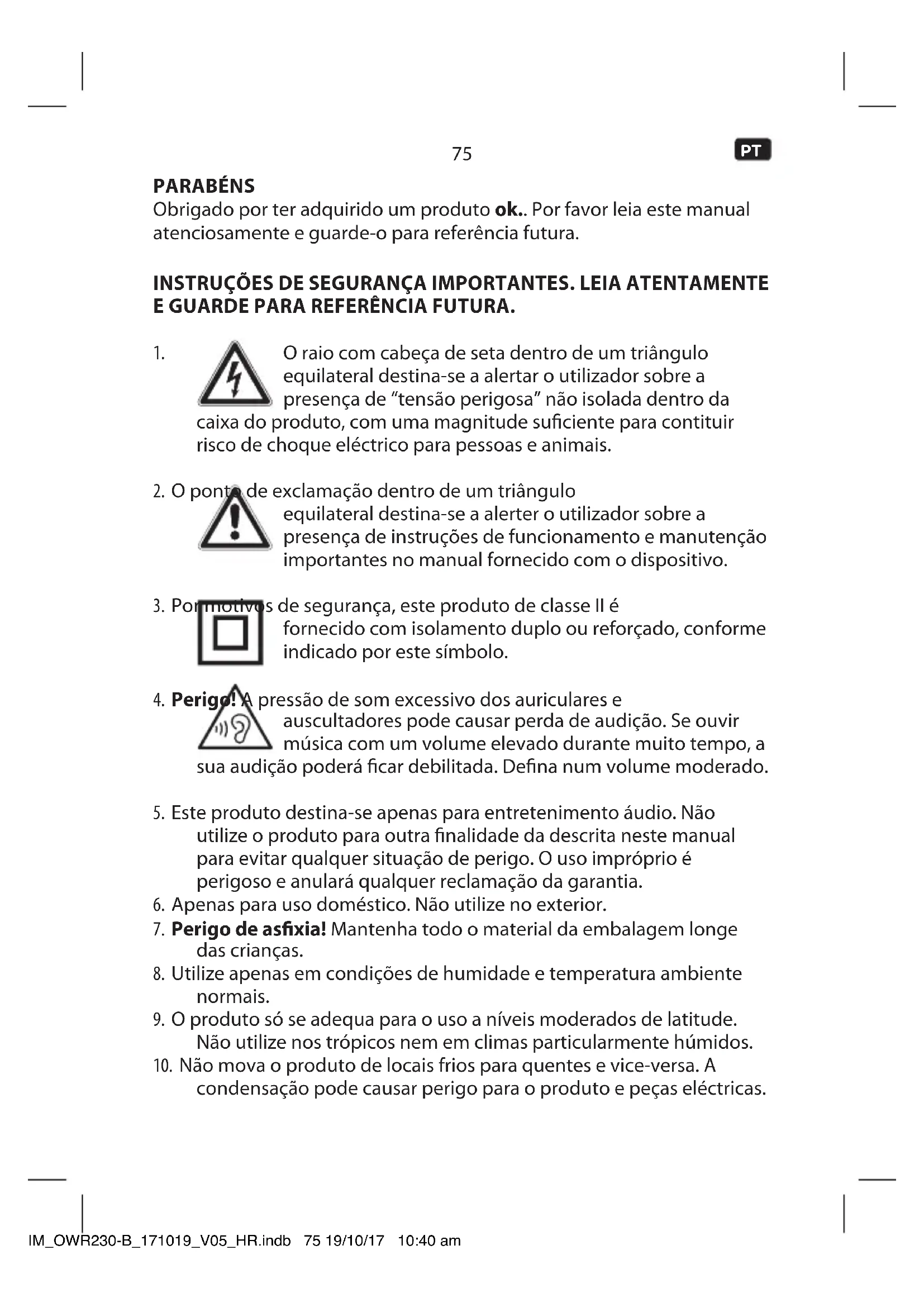 em conformidade. Evite que o ácido das pilhas entre em contacto com a pele e os olhos. Se o ácido entrar em contacto com os olhos, lave-os com muita água e consulte imediatamente um médico. Se o ácido das pilhas entrar em contacto com a pele, lave a área afectada com muita água e sabão. UTILIZACAO PREVISTA Este produto destina-se a reprodução de áudio através de FM/AM Radio, AUX IN ou auscultadores. Qualquer outra utilizacao pode resultar em danos para o produto ou ferimentos. Este produto destina-se apenas a uso domestico e nao se destina a uso comercial. A Imtron GmbH não assume qualquer responsabilidade por danos provocados no produto, por danos de propriedade ou por lesões pessoais resultantes do uso descuidado ou inadequado do produto ou da utilização do produto que não esteja de acordo com a nalidade especicada pelo fabricante. IM_OWR230-B_171019_V05_HR.indb 78 19/10/17 10:40 am79