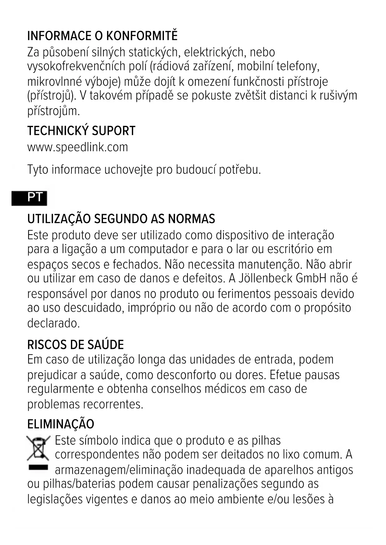Este produto deve ser utilizado como dispositivo de interação para a ligação a um computador e para o lar ou escritório em espaços secos e fechados. Não necessita manutenção. Não abrir ou utilizar em caso de danos e defeitos. A Jöllenbeck GmbH não é responsável por danos no produto ou ferimentos pessoais devido ao uso descuidado, impróprio ou não de acordo com o propósito declarado.